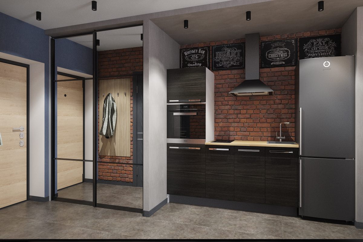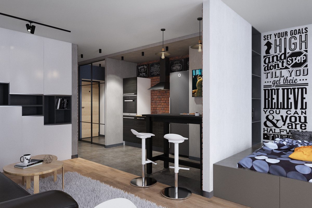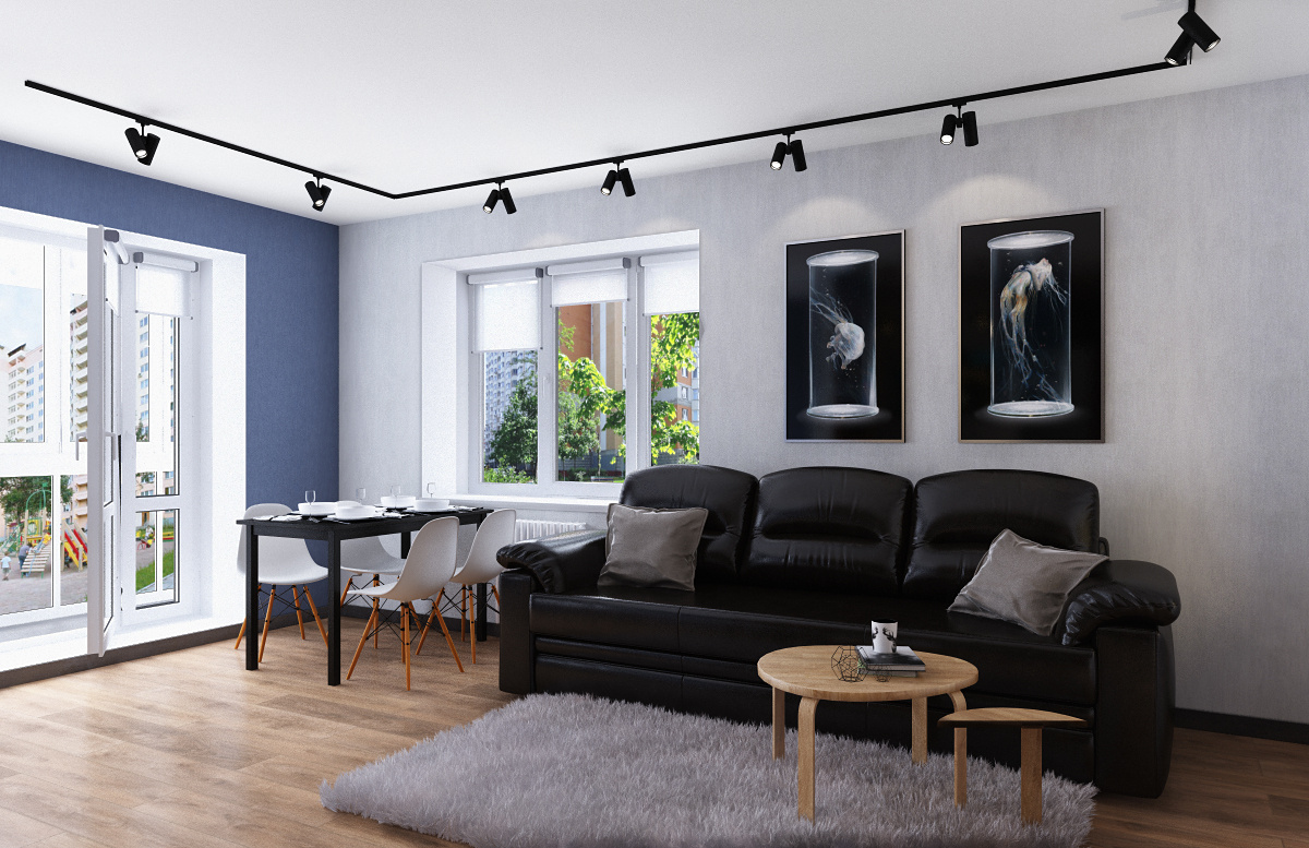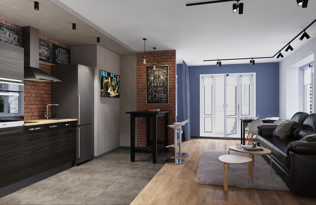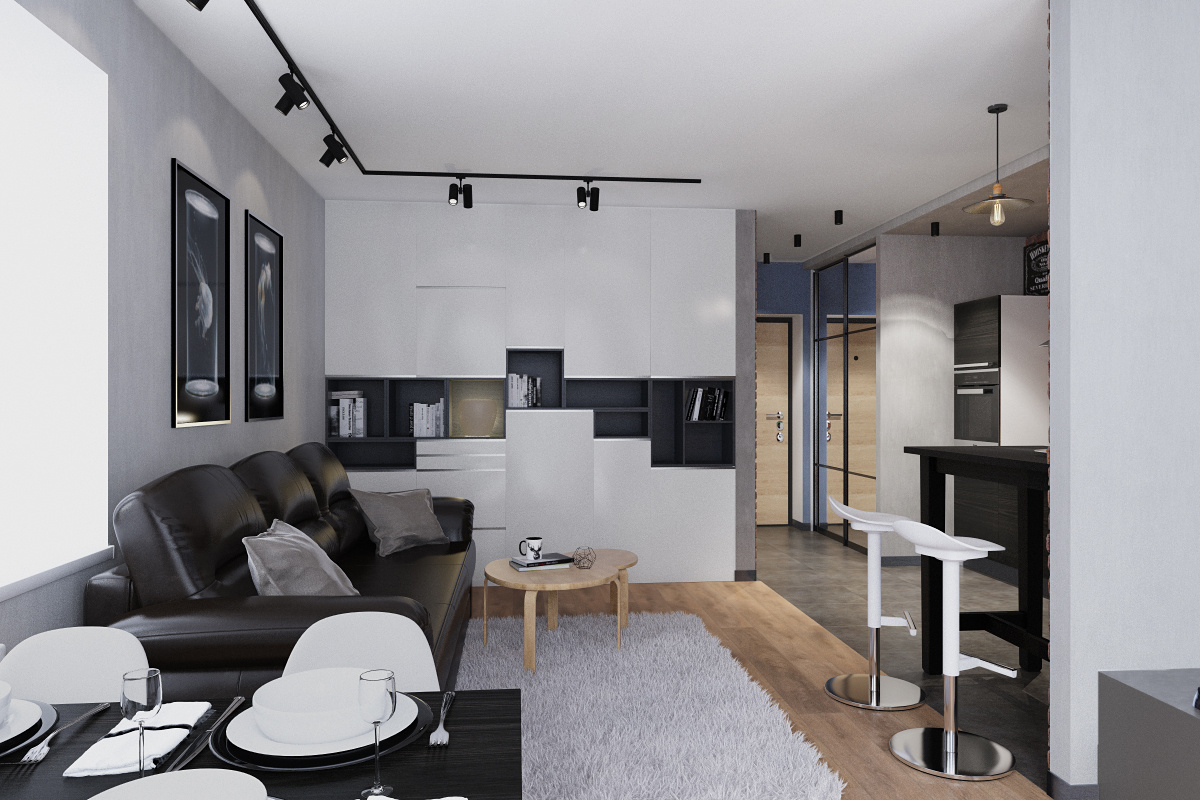Пожелания заказчика: современный интерьер с элементами стиля лофт, отсутствие текстиля на окнах, вместительную систему хранения вещей, облегченный вариант кухни без верхних шкафов и нескольку групп освещения.