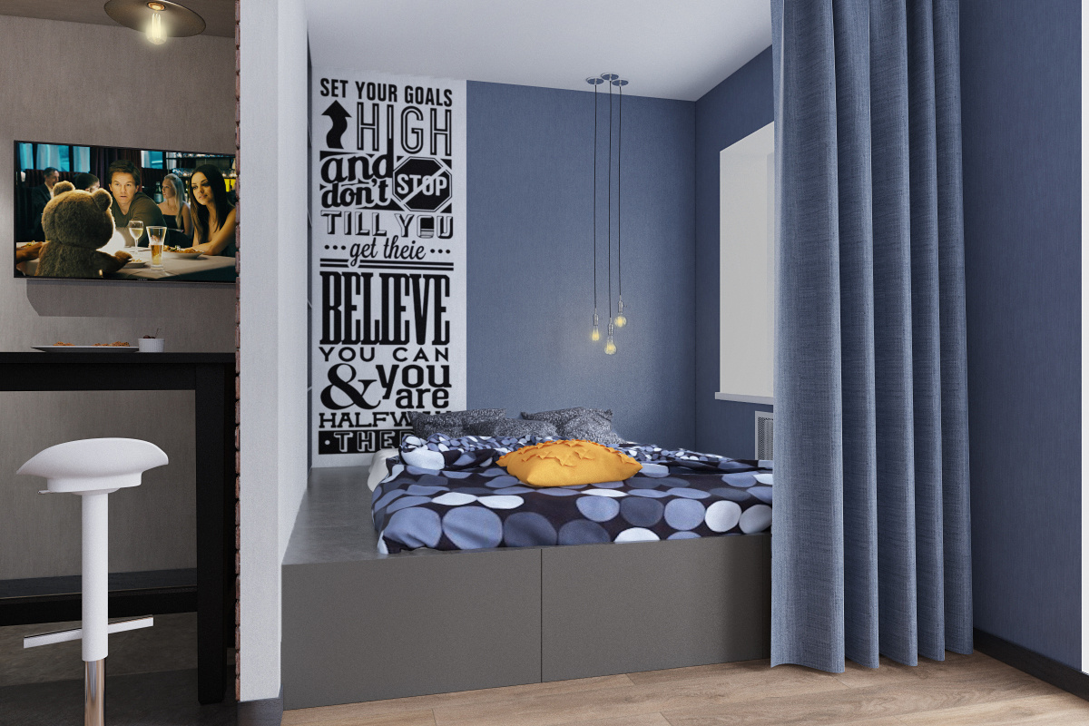 - Выделенную при помощи перегородки из гипсокартона спальную зону с кроватью на подиуме.