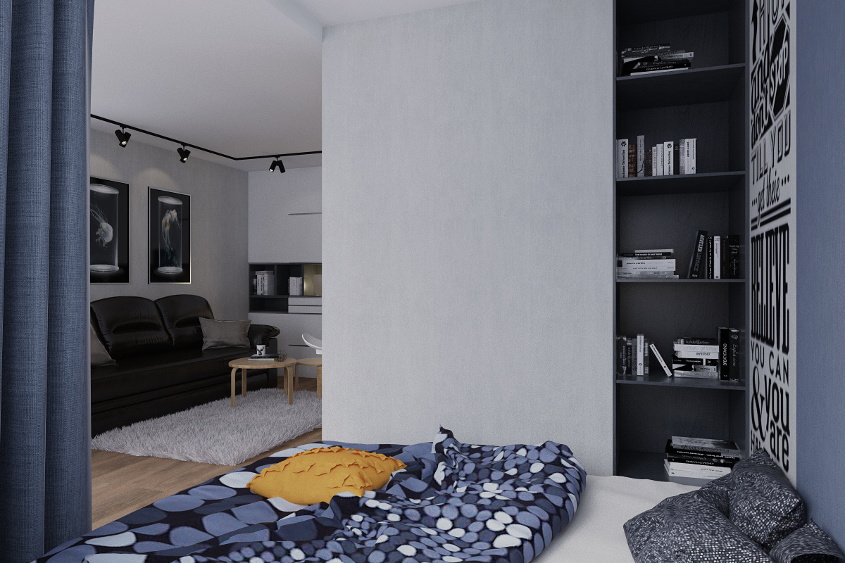 Результат работы над проектом: Небольшая гардеробная с зеркальными фасадами была размещена при входе, за счет необольшой перегородки из гипсокартона появилась ниша для системы хранения в виде шкафа со встроенными открытыми полками. Спальная зона отгорожена перегородкой из гипсокартона, кровать размещена на подиум, имеющий выдвижные короба для хранения. В нише сбоку от кровати расположены открытые полки для книг и аксессуаров. Ощущение свободного пространства достигается за счет легкого разграничения и эргономичной планировки помещения. Большие окна и выход на балкон было решено не закрывать текстилем, чтобы сохранить естественное освещение и добавить ощущение перспективы пространства. На окнах и балконной двери установлены рулонные шторы.