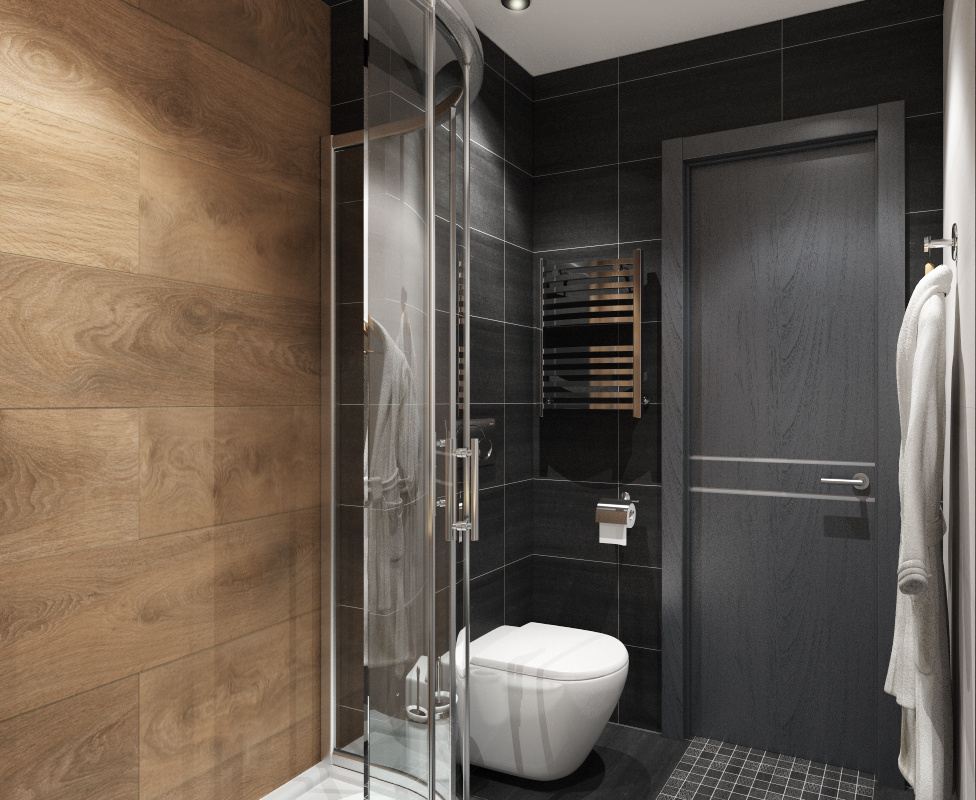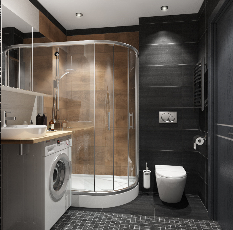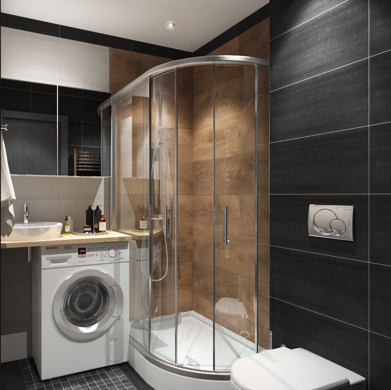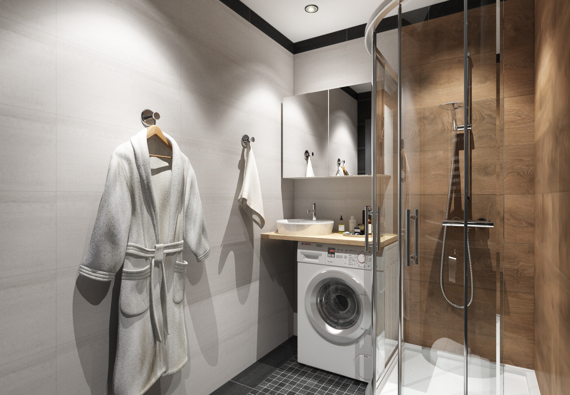 - Совмещенный санузел с небольшой душевой кабиной и инсталляцией унитаза.