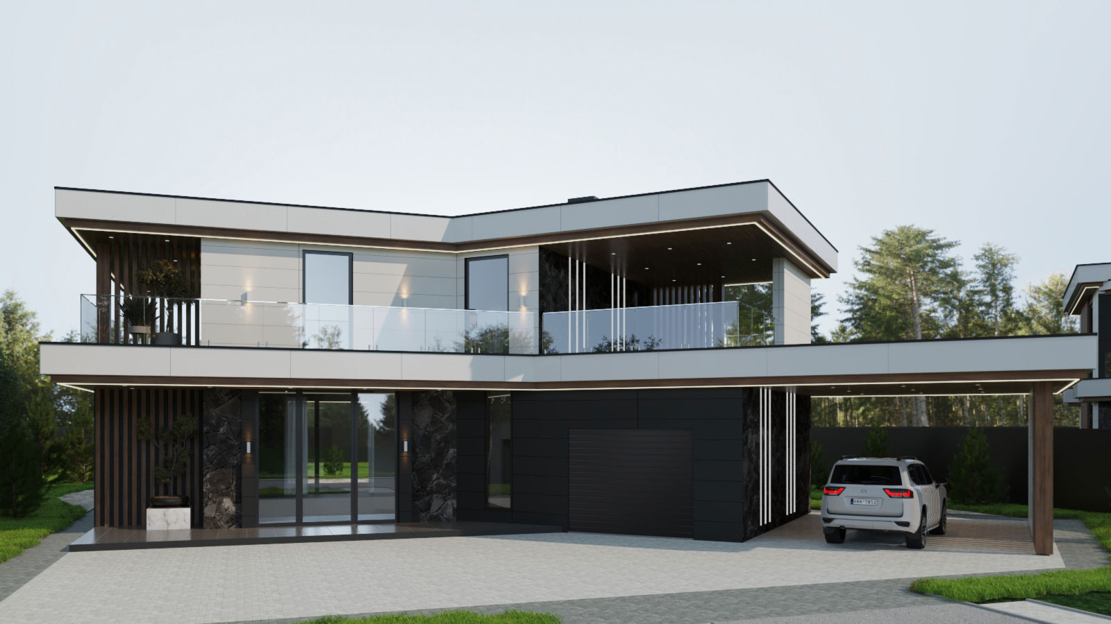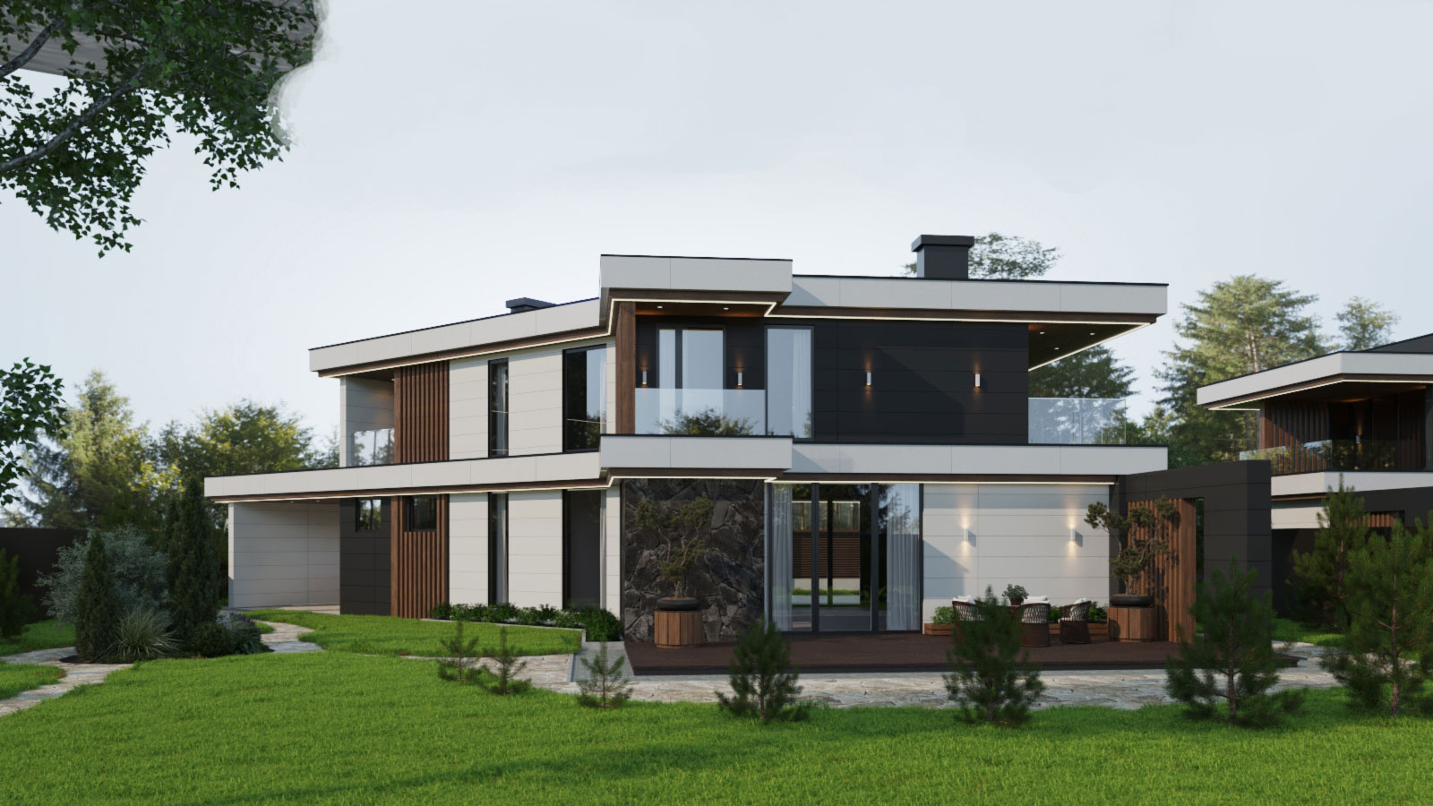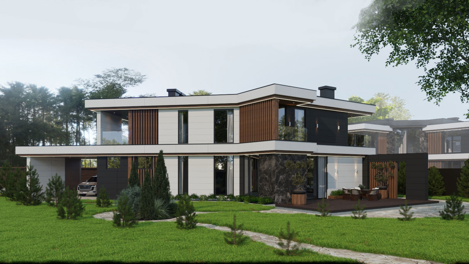 Архитектурный проект загородного дома премиум класса 265 кв.м. Для проекта коттеджного поселка в п. Машкачи (г. Киров) выполнена разработка 3 типов современных двухэтажных домов в единой стилистике, каждый из которых имеет индивидуальные архитектурные особенности и изначальную планировку, которую по желанию конечного клиента можно изменить.