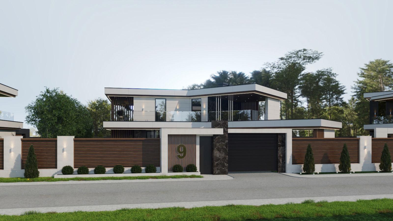 Несмотря на различия, каждый дом имеет навес для авто, гараж с хозблоком и просторную террасу. Архитектура домов с плоской кровлей и панорамными окнами выполнена в стиле современный минимализм с использованием в отделке преимущественно натуральных материалов. Специфика остекления домов гарантирует обилие естественного освещения.