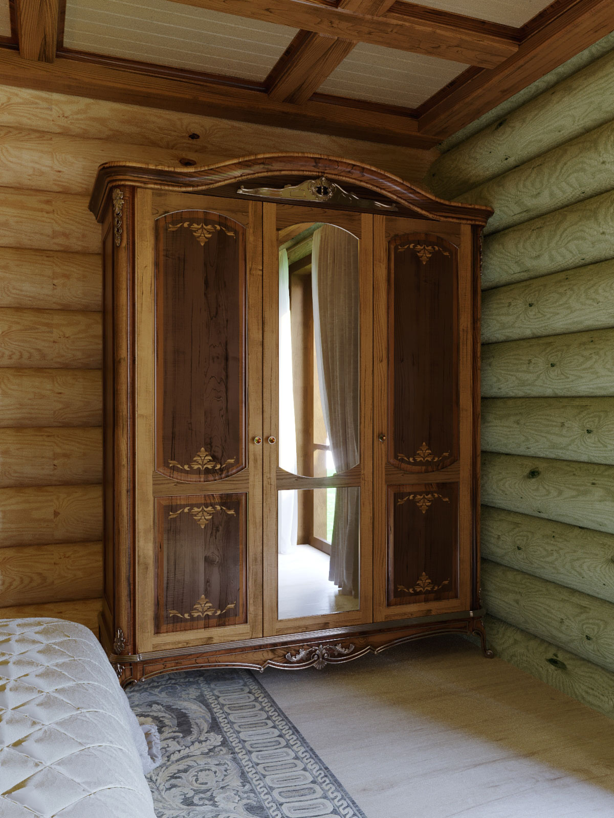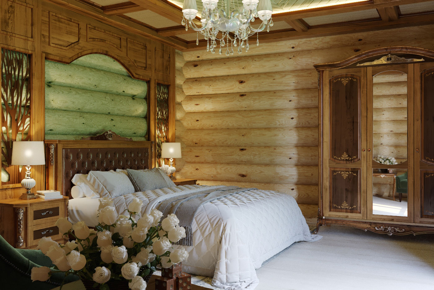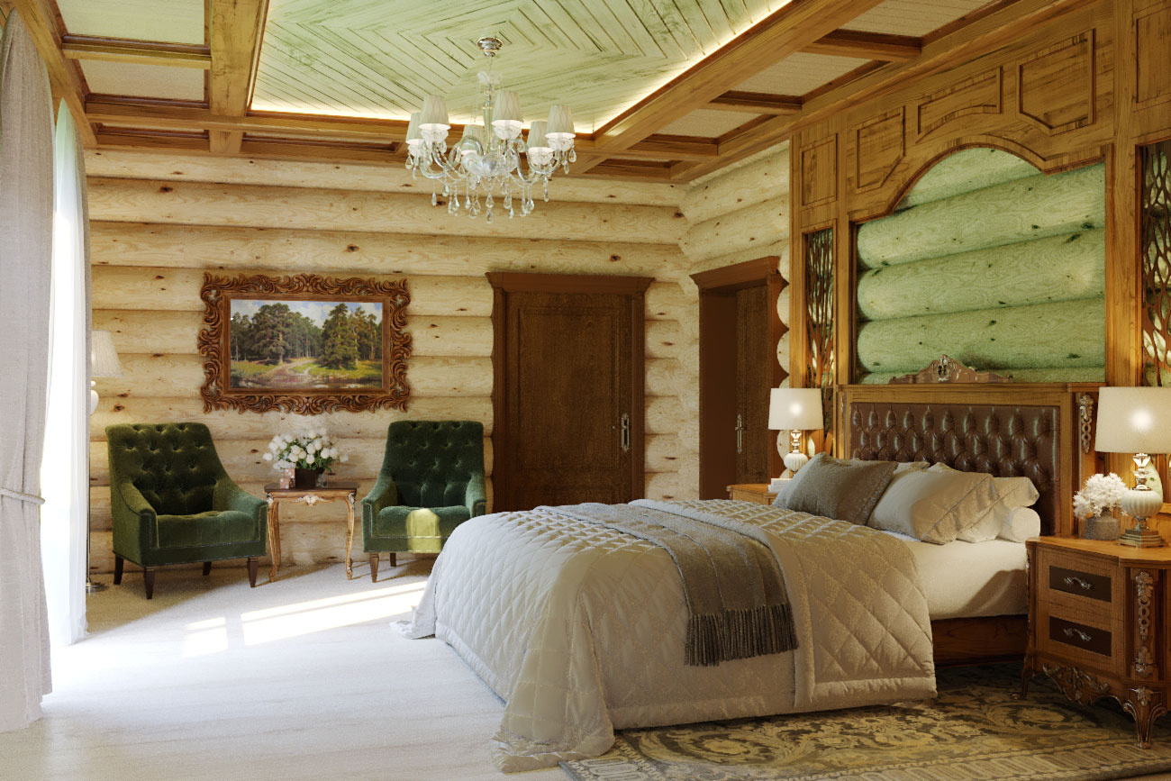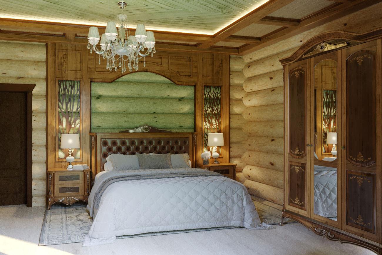 Дизайн проект интерьера спальни в классическом стиле в деревянном доме в Кирове.