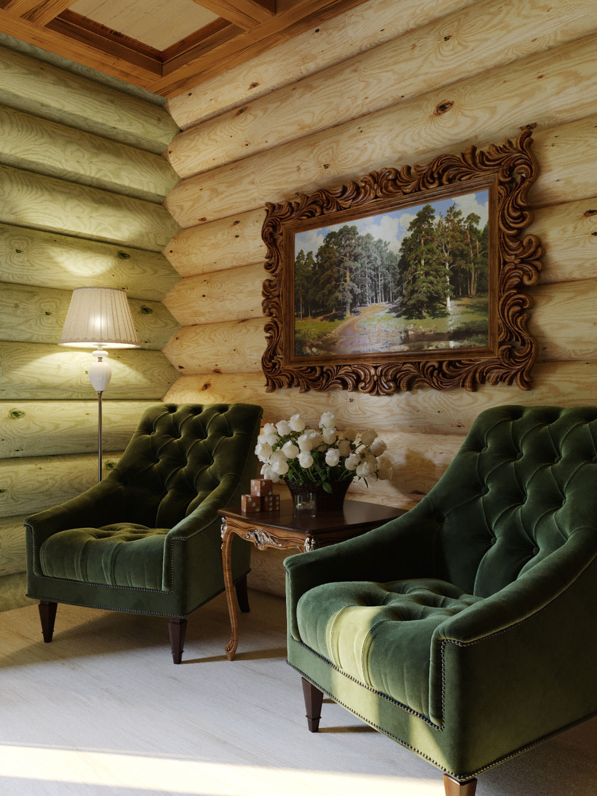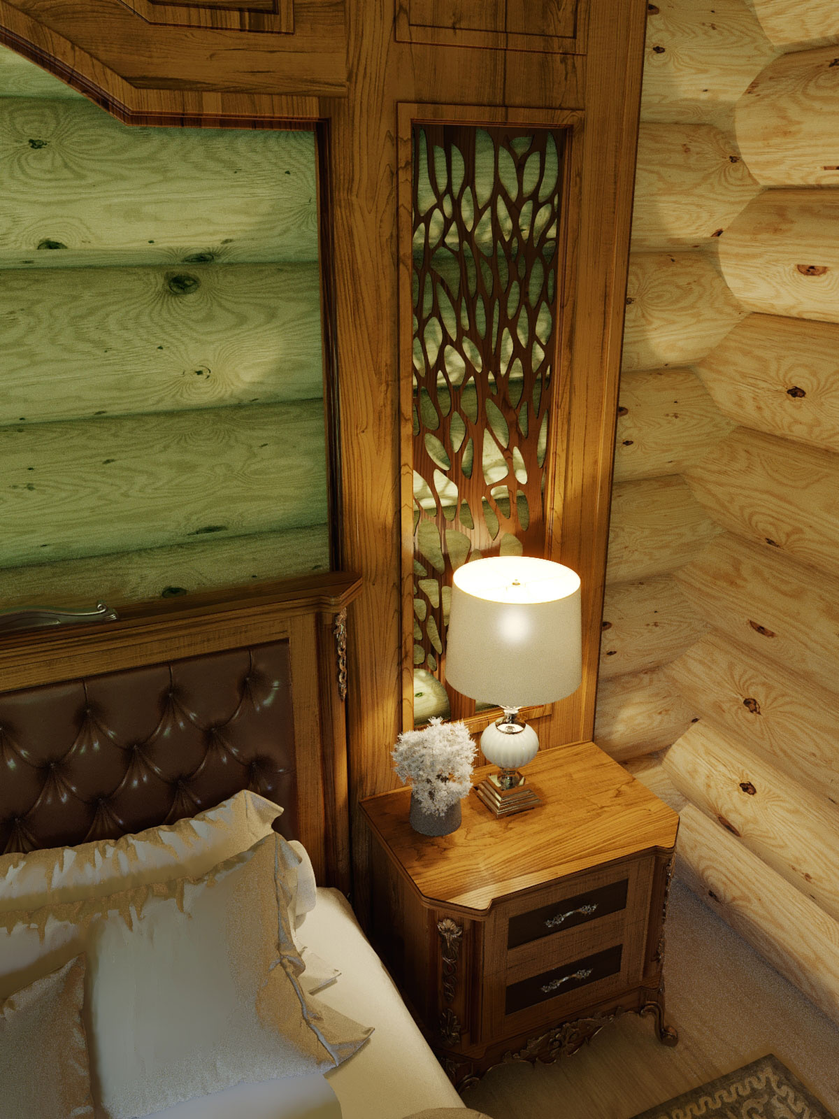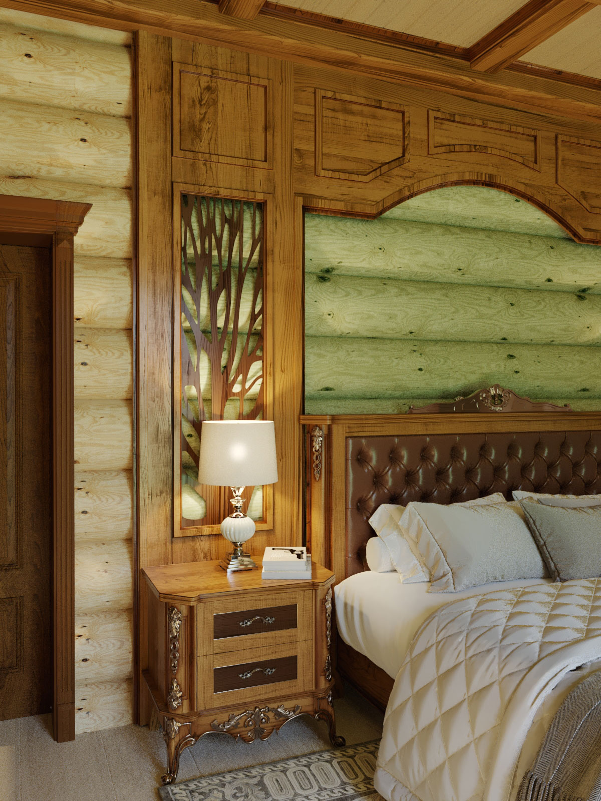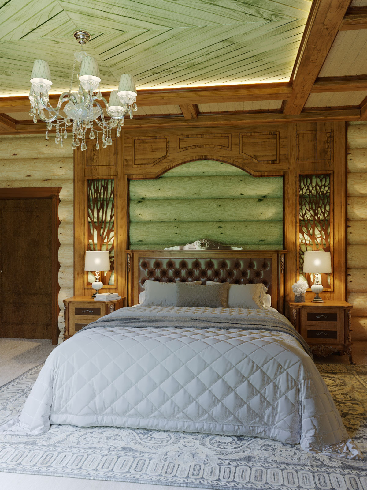 В проекте использовано: мебель из массива дуба в цвете палисандр с золочением фабрики Пинскдрев, мягкие кресла фабрики Хорека, светильники от производителей Newport (США), Garda Decor (Россия) и Favourite (Германия). Для отделки стены в спальной зоне разработана индивидуальная мебельная конструкция из массива дерева, для отделки потолка выбрано сочетание деревянных потолочных балок и доски, окрашенной в фисташковый оттенок.