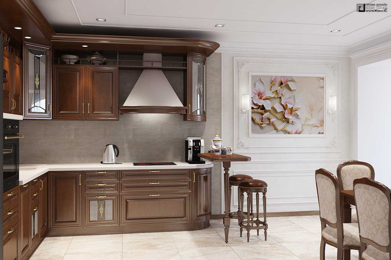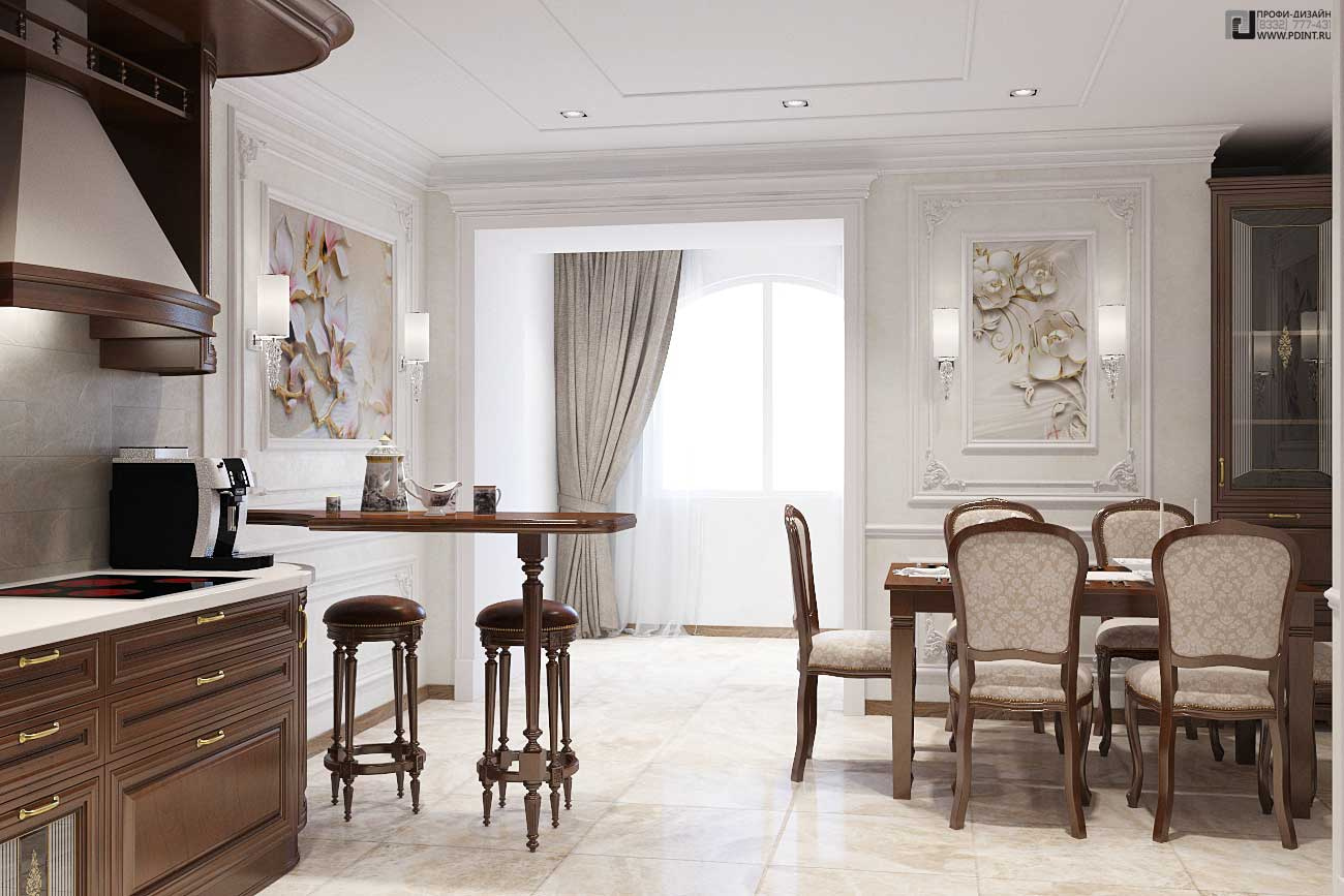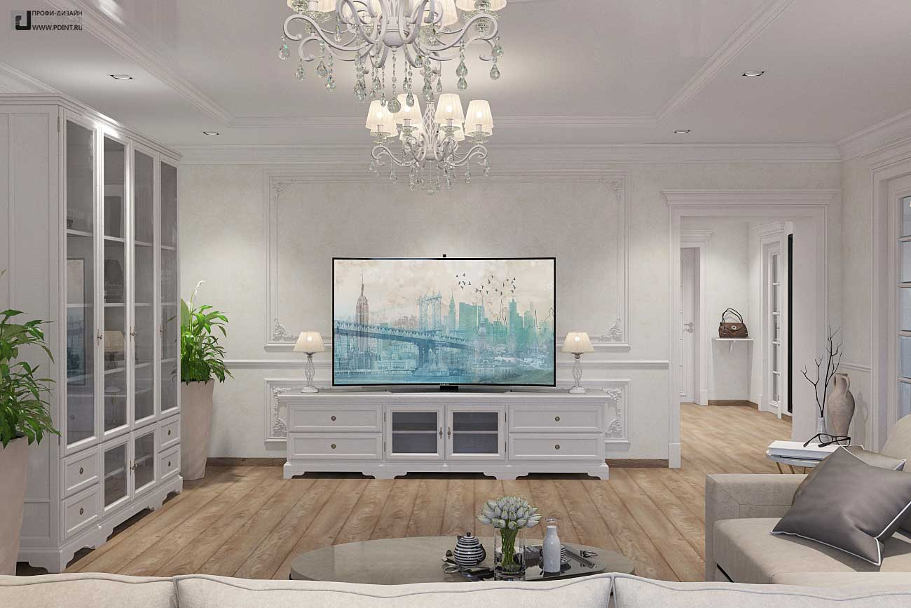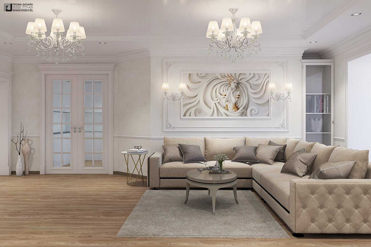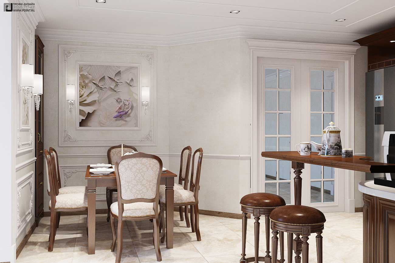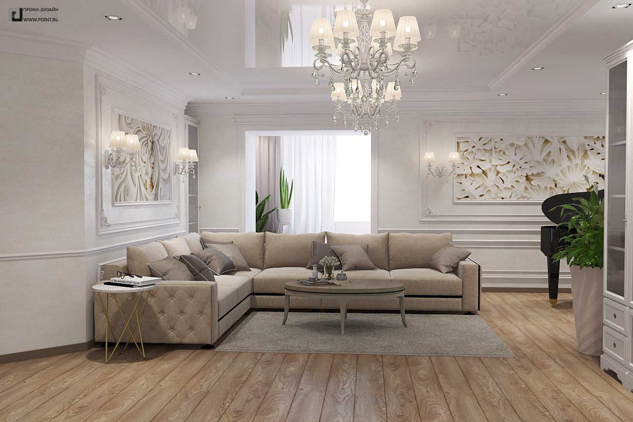 Дизайн интерьера кухни, гостиной и коридора выдержан в единой цветовой гамме и стилистике. Для отделки стен использована декоративная штукатурка Ticiana Deluxe с индивидуальной колеровкой отдельных помещений и лепной декор марки Perfect. Для отделки пола использована паркетная доска Antic Wood.Для оформления потолка по всей площади квартиры выбраны 1-уровневые подвесные потолки из ГКЛ с отделкой лепным декором. В центральной части гостиной – натяжной потолок.