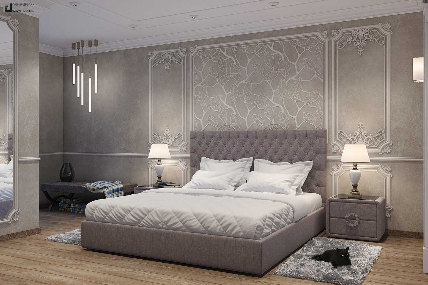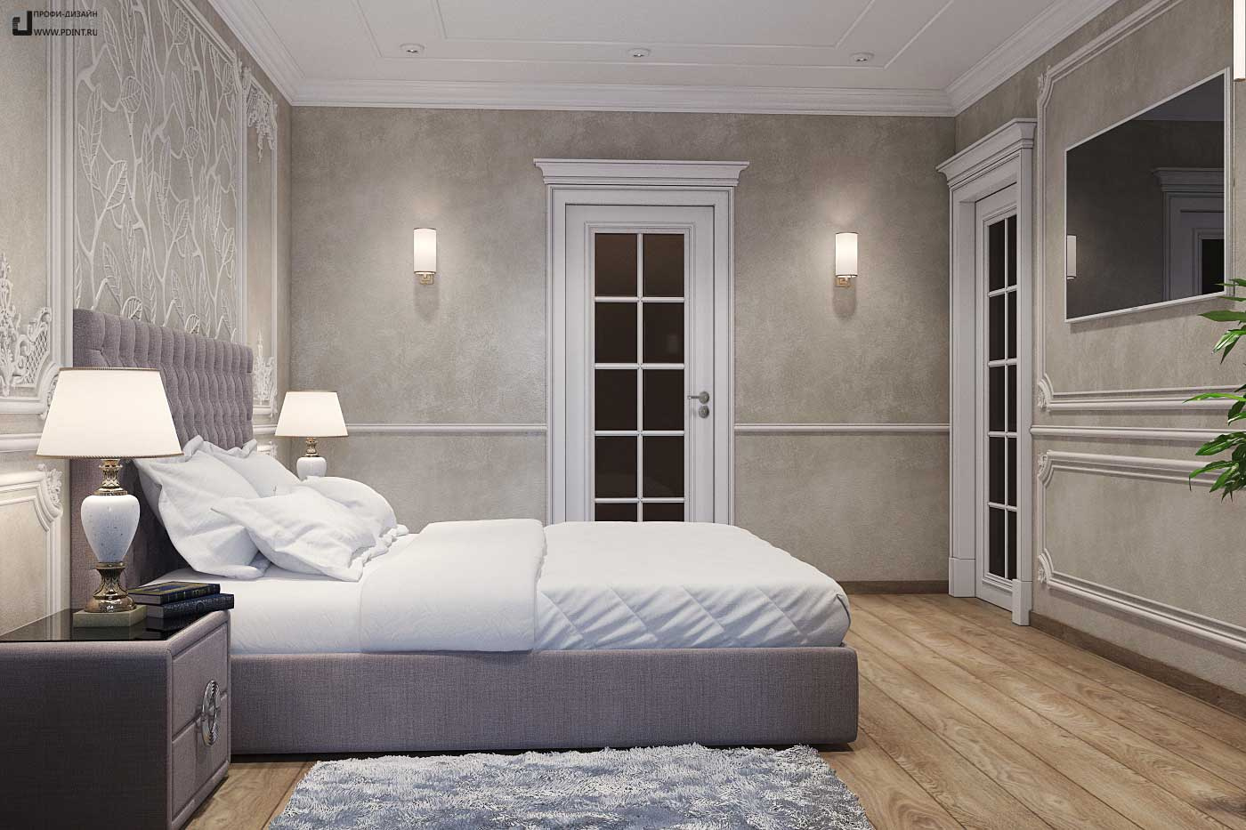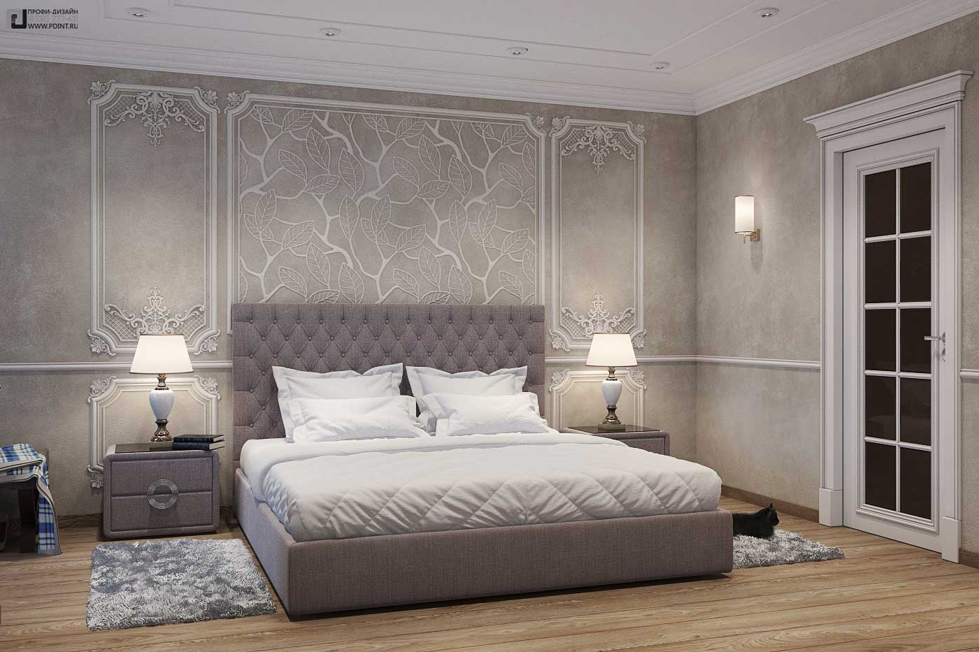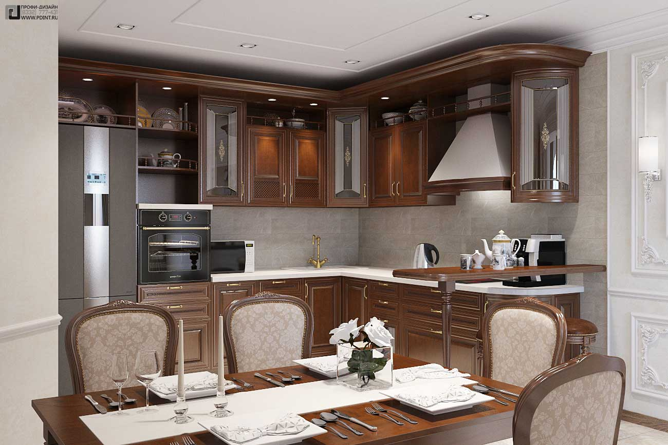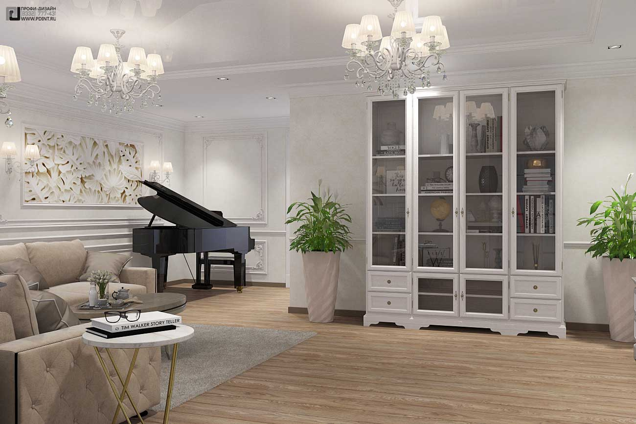 Дизайн интерьера кухни, гостиной и коридора выдержан в единой цветовой гамме и стилистике. Для отделки стен использована декоративная штукатурка Ticiana Deluxe с индивидуальной колеровкой отдельных помещений и лепной декор марки Perfect. Для отделки пола использована паркетная доска Antic Wood.Для оформления потолка по всей площади квартиры выбраны 1-уровневые подвесные потолки из ГКЛ с отделкой лепным декором. В центральной части гостиной – натяжной потолок.