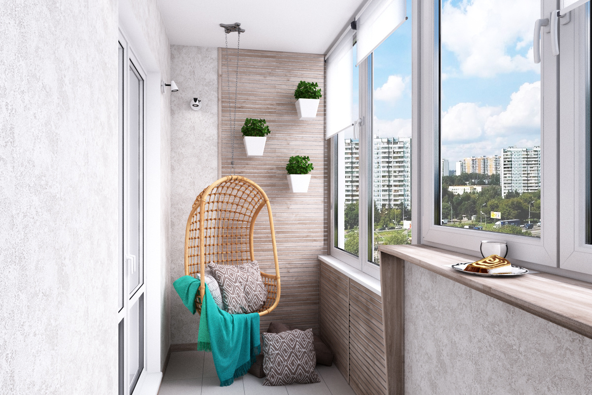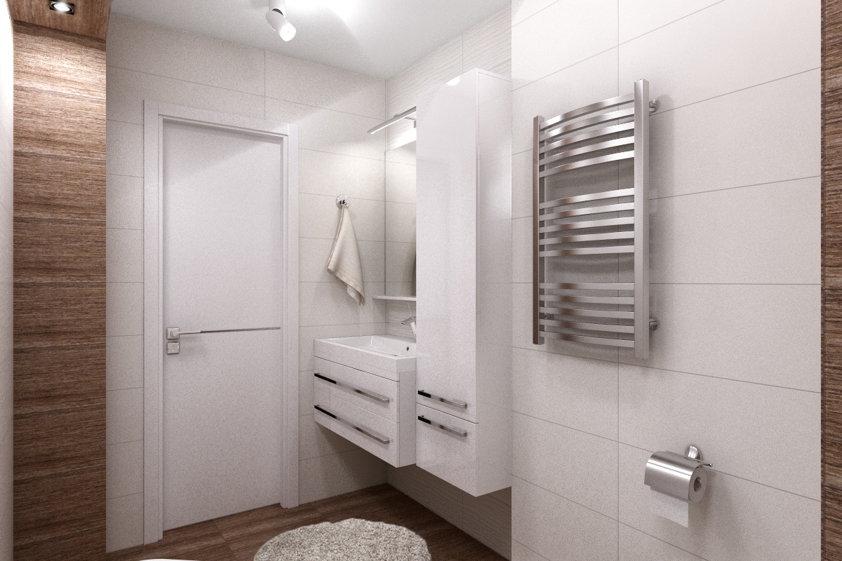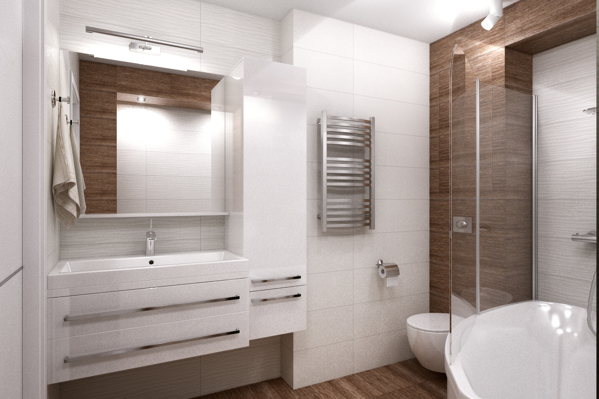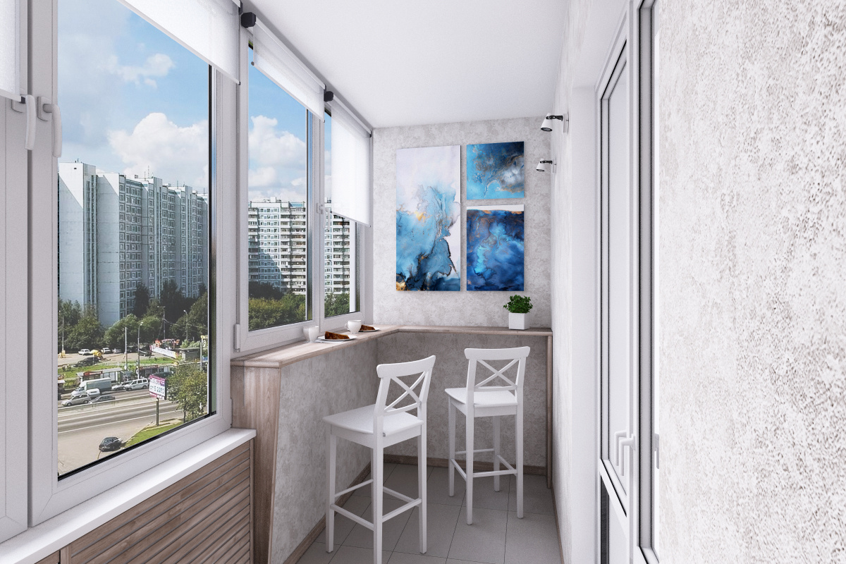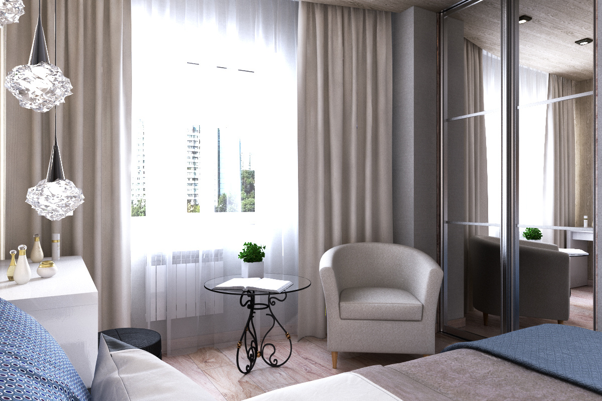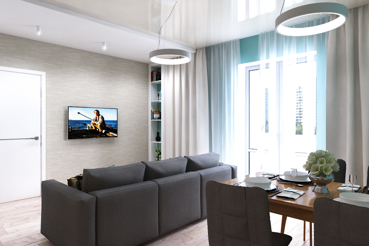 Квартира имела достаточно удачную существующую планировку, поэтому при создании дизайн проекта изначальная планировка квартиры не подвергалась существенным изменениям. Квартира студия получилась очень комфортной и эргономичной: объединенное пространство зоны кухни обеденным столом и гостиной, просторная спальная комната с гардеробной, балкон с выделенной зоной для отдыха, прихожая с системой для хранения в виде шкафов, расположенных в нише. Небольшой совмещенный санузел за счет правильной планировки позволил вместить в свое пространство все необходимое: угловую ванну со стеклянной перегородкой, подвесной унитаз с инсталляцией, большую раковину с зеркалом и местами для хранения, а также водонагреватель и стиральную машину. Интерьер квартиры выдержан в современном стиле, цветовая гамма в легких светлых тонах. При разработке дизайн проекта за основу были выбраны оттенки белого, серого и бежевого цвета, в качестве акцентов в интерьере комнат использован небесно-голубой цвет и хромированные детали в декоративных элементах.