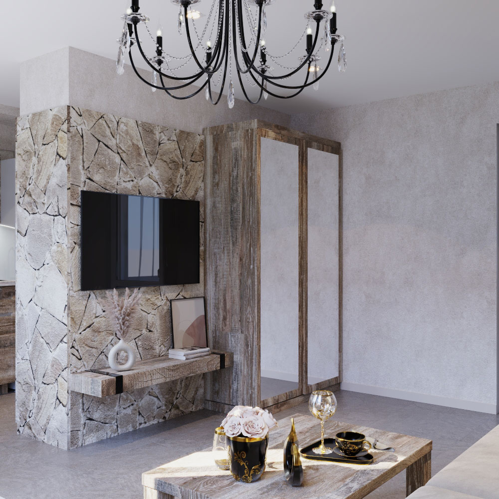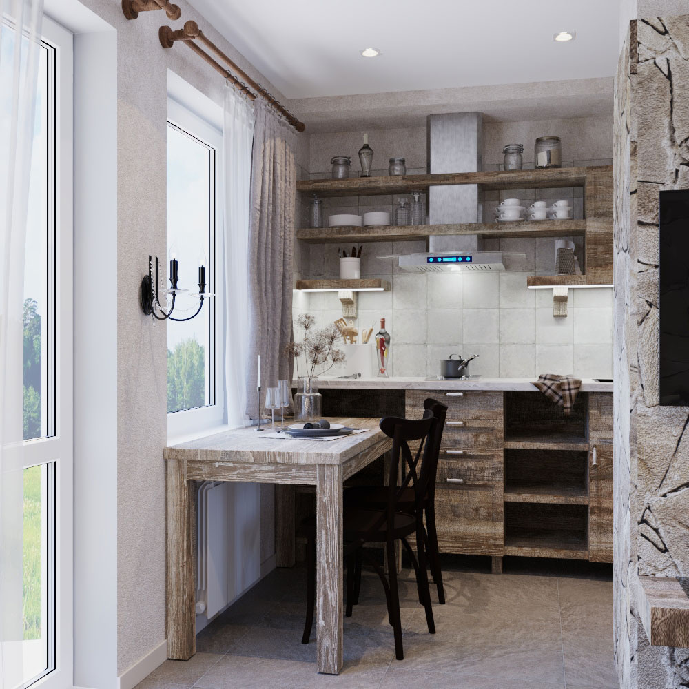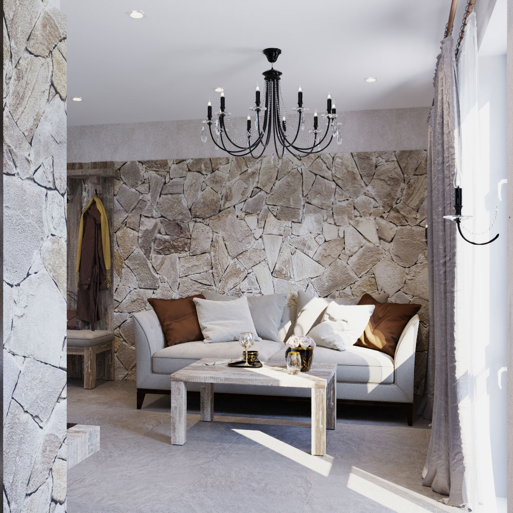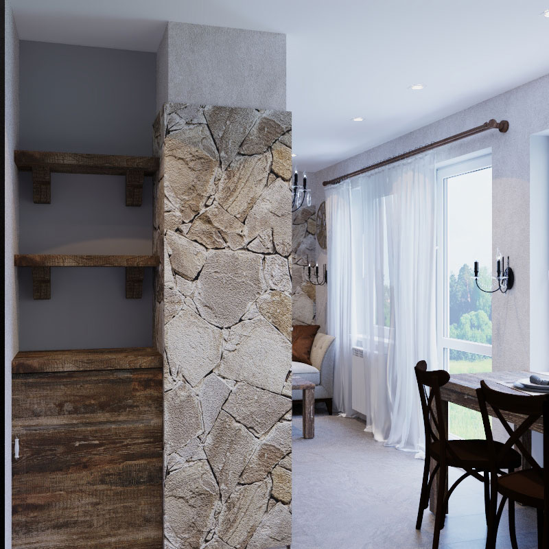 Пожелания заказчика: "мужской характер" помещения, элементы "кавказкого" стиля, мебель из массива, отделка стен натуральным камнем, функциональная кухня с открыми и крытыми местами для хранения.