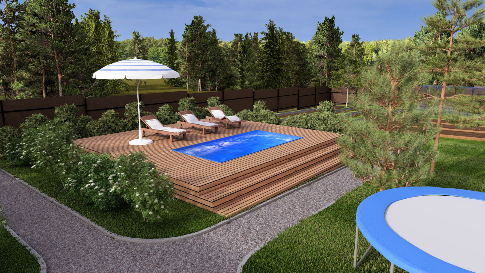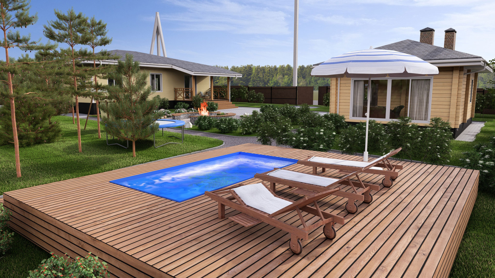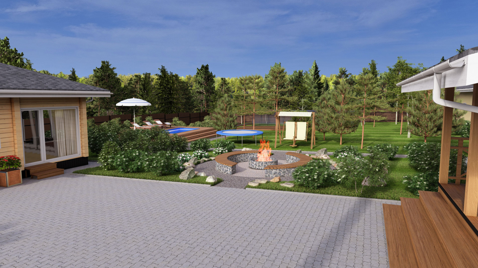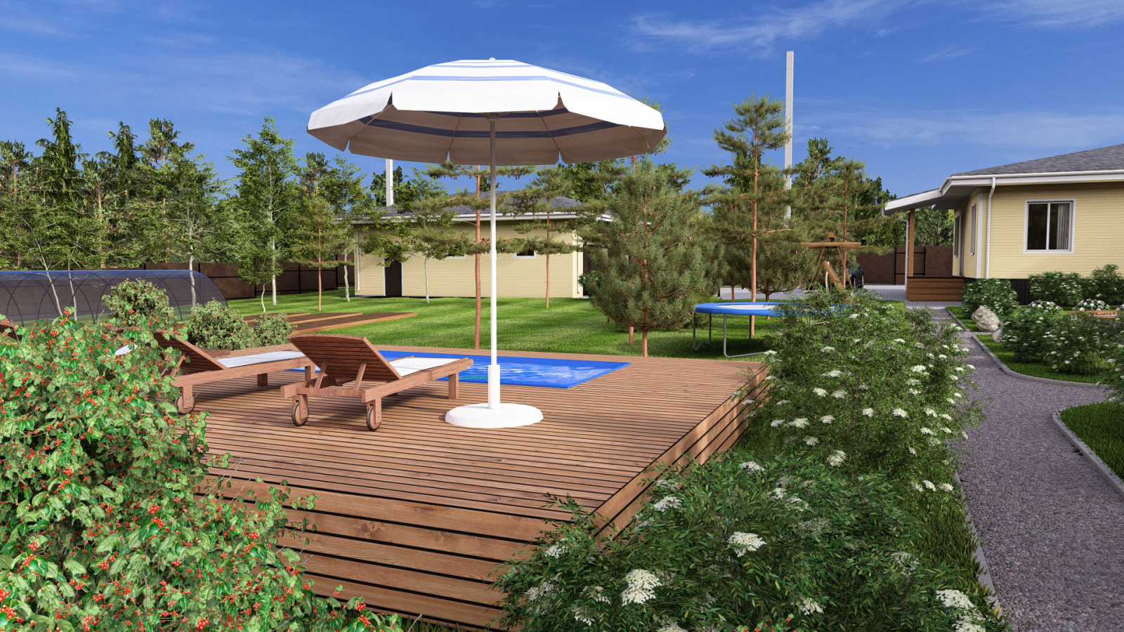 Дизайн проект загородного участка с баней и бассейном, выделенной зоной отдыха и гаражом с навесом в Кирове.
