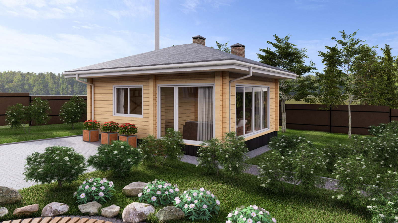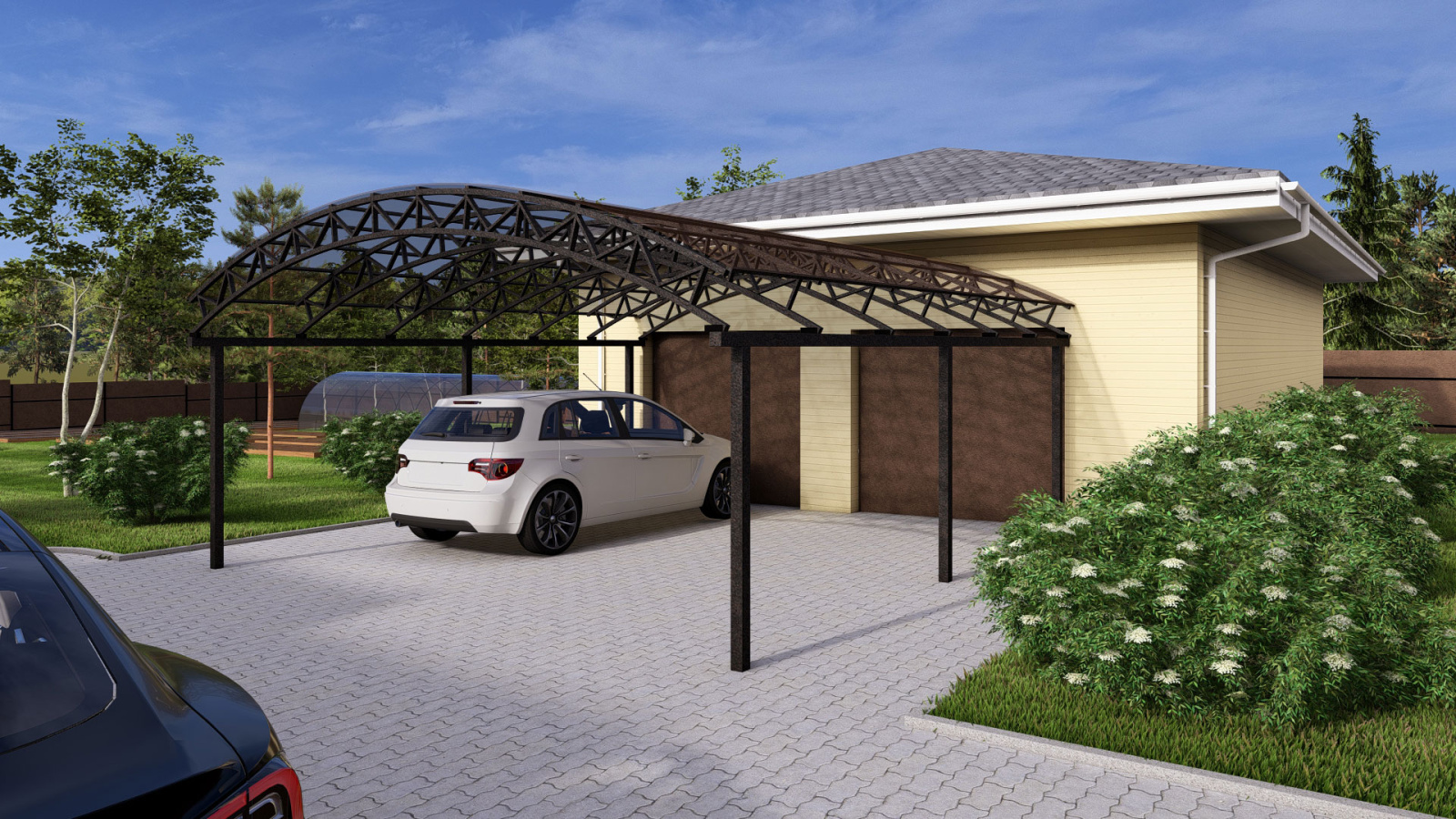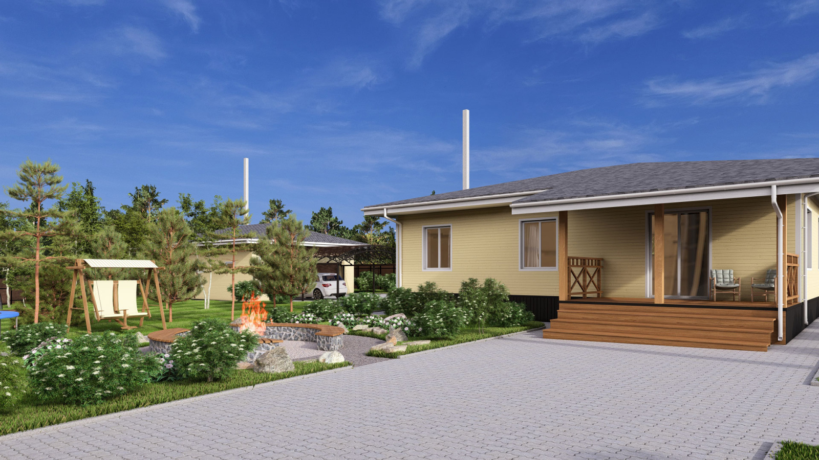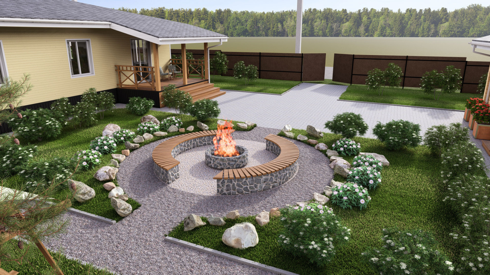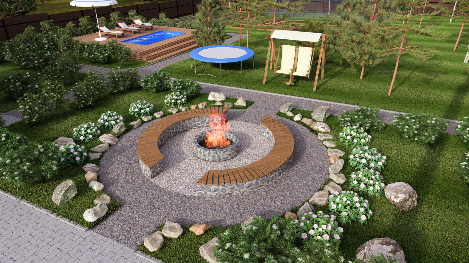 Дизайн проект загородного участка с баней и бассейном, выделенной зоной отдыха и гаражом с навесом в Кирове.