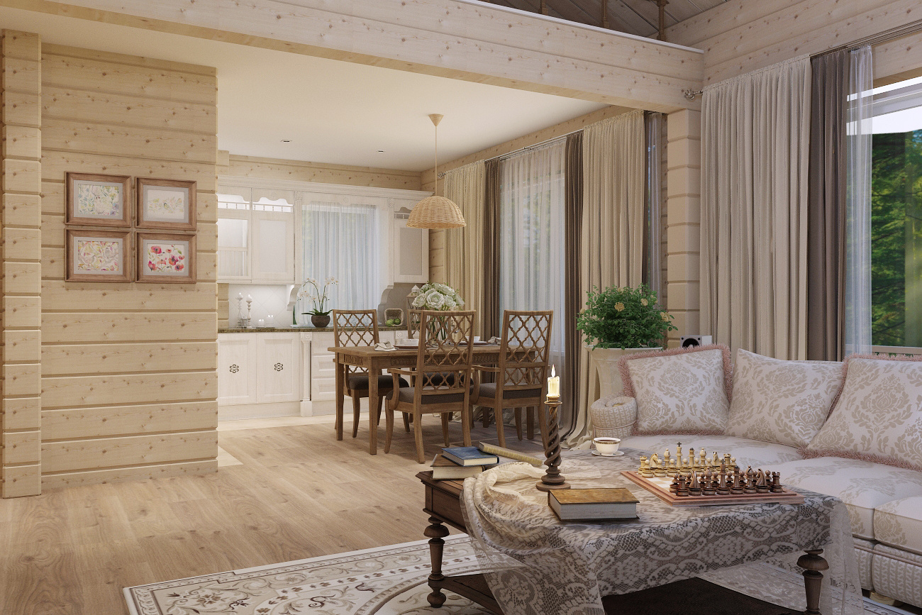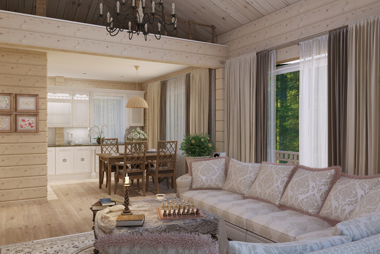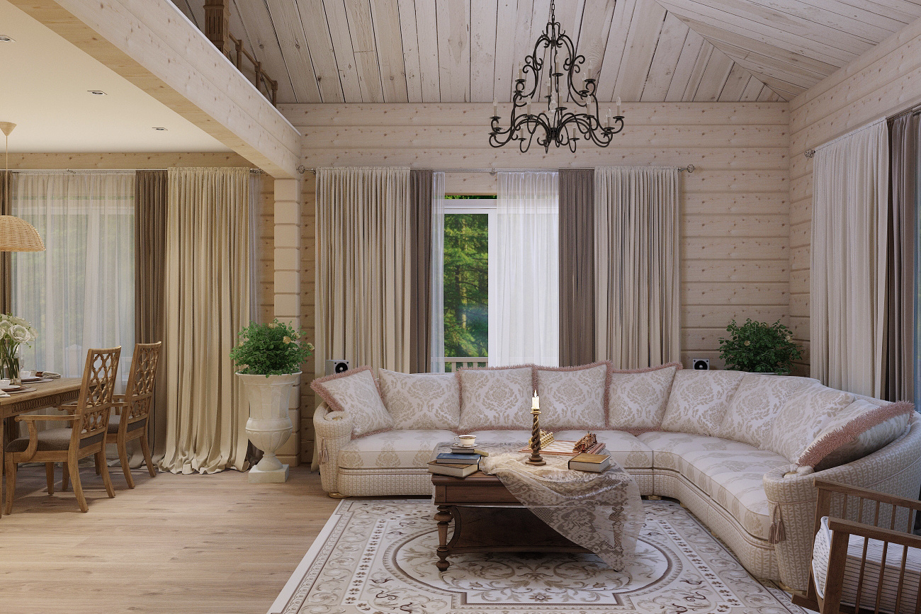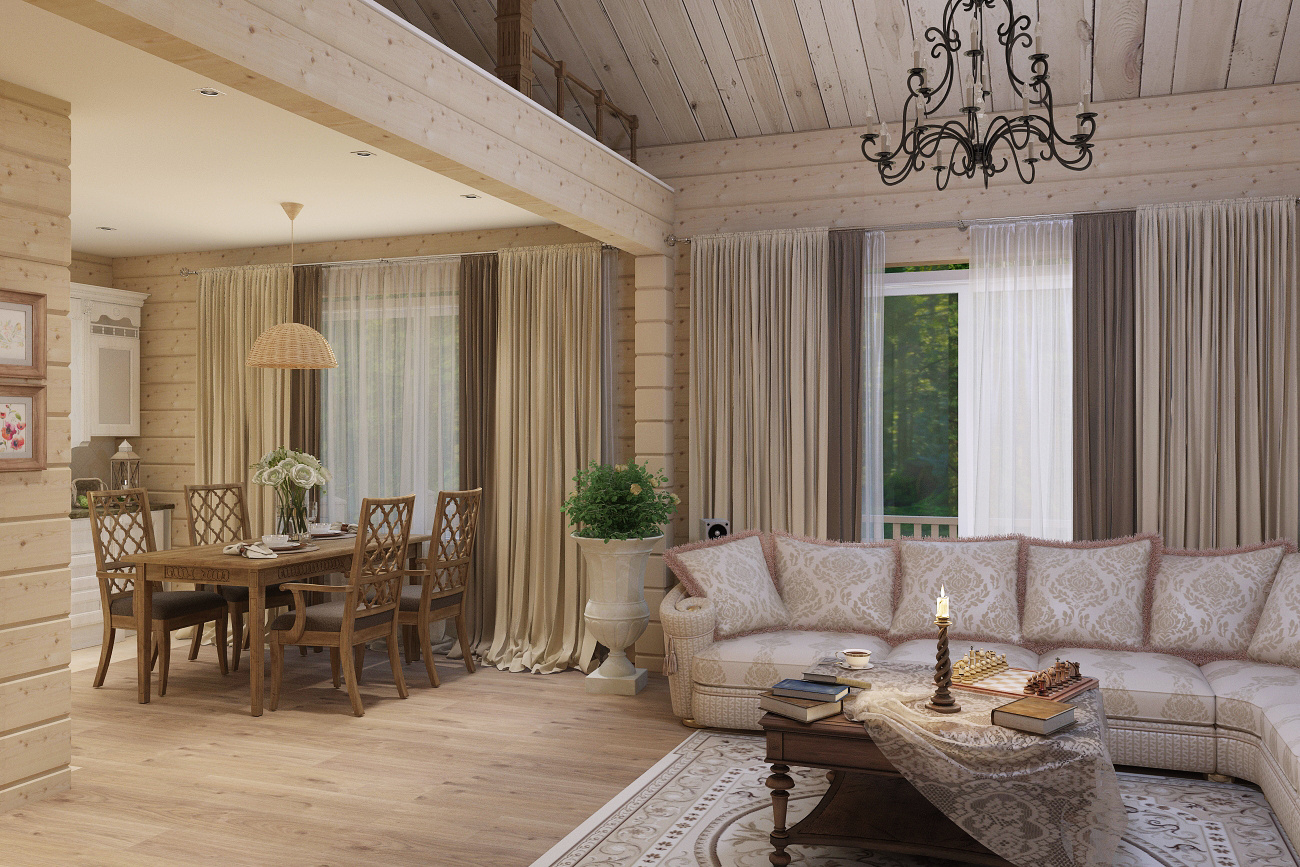 Дизайн проект интерьера одноэтажного дома из бруса в Кирове. На основании пожеланий клиента, для отделки дома были выбраны натуральные и экологичные материалы: натуральное дерево для декоративных элементов, мебель из массива, натуральный текстиль в обшивке мягкой мебели, шторах и декоративных элементах.