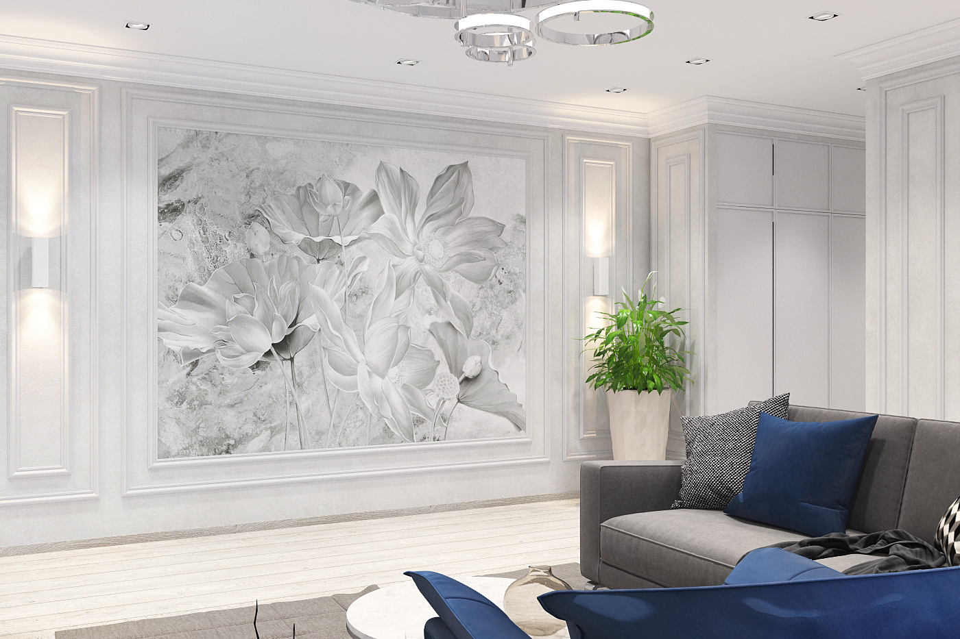 Дневная часть квартиры представлена объединенным пространством гостиной с небольшой, но функциональной кухней и прихожей. Для отделки стен выбрана декоративная штукатурка с эффектом перламутрового бархата Versailes Ticiana Deluxe, лепной декор Европласт и Перфект. Цветовая гамма - светлые, чистые, прохладные тона. Акцентные тона - насыщенный синий и оттенки серого.