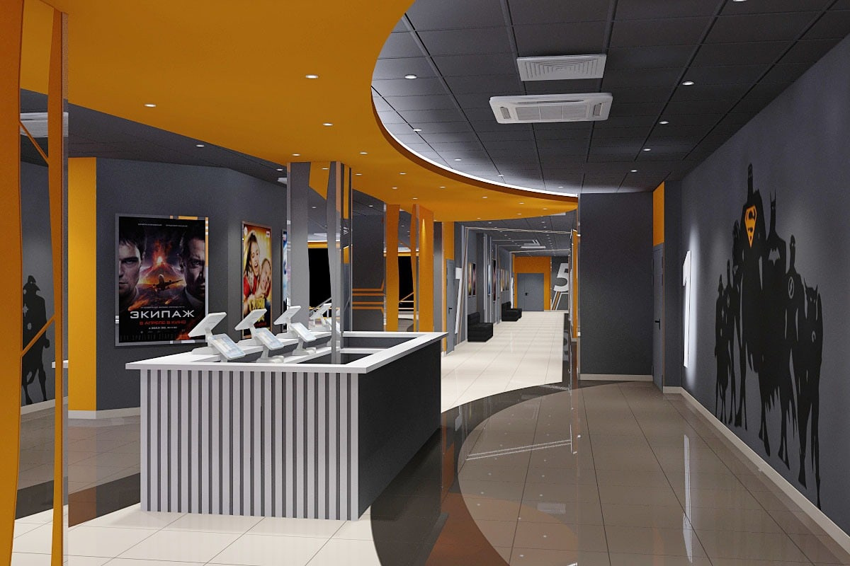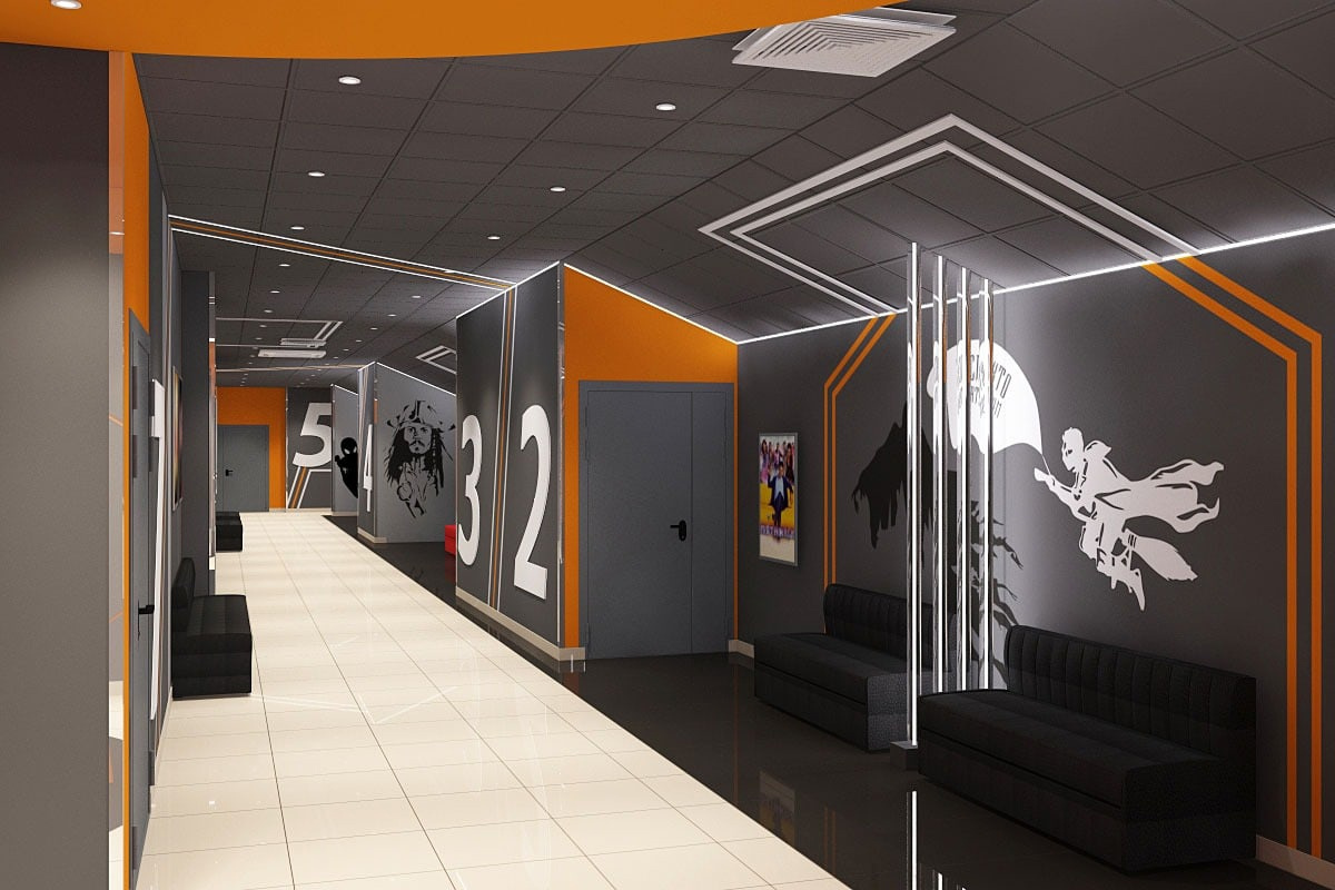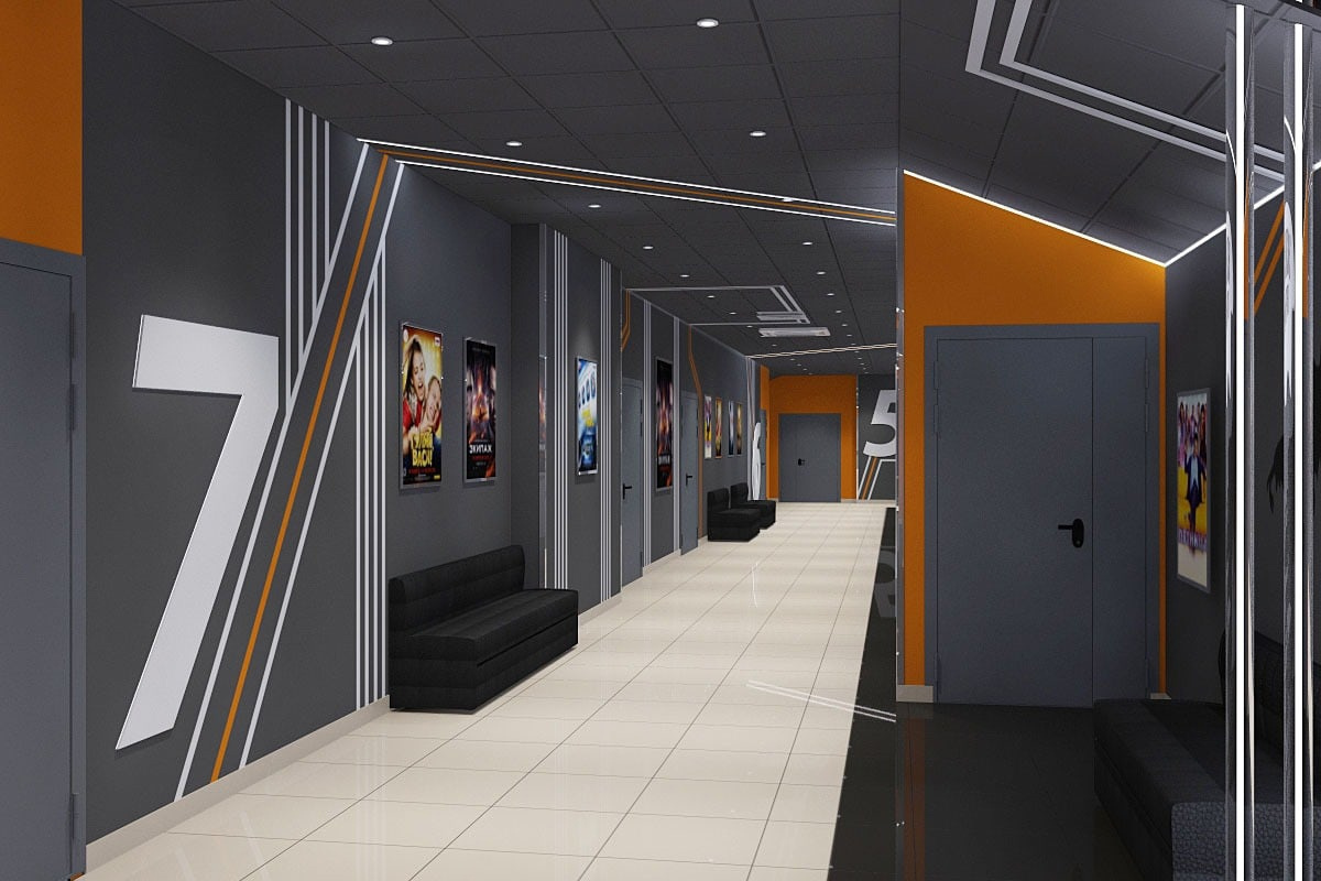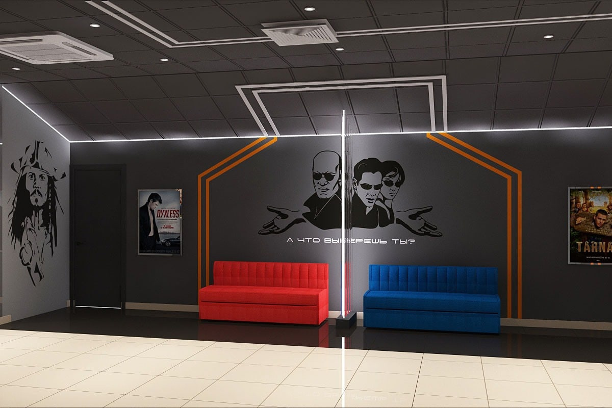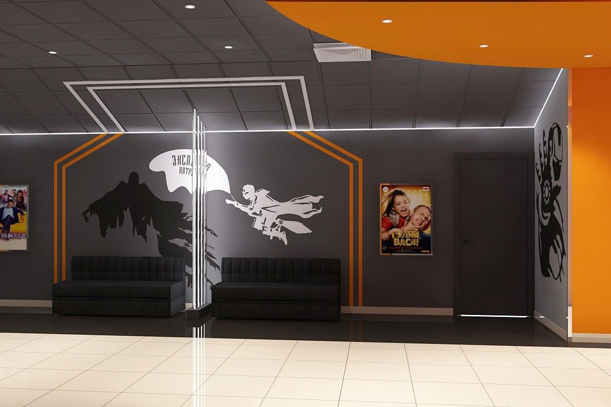 Пожелания заказчика: Необходимо было разработать дизайн проект с учетом фирменного стиля торгового центра, цветовая гамма и стилистика интерьера кинотеатра должна гармонично сочетаться с основными цветами и стилем ТЦ. Также нужно было учесть, что реализация проекта должна быть произведена в краткие сроки и без создания неудобств для посетителей кинотеатра.