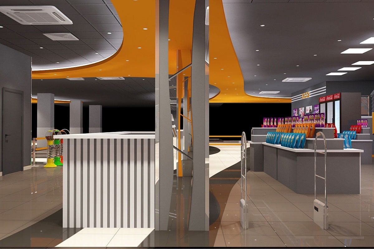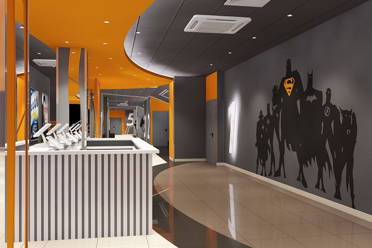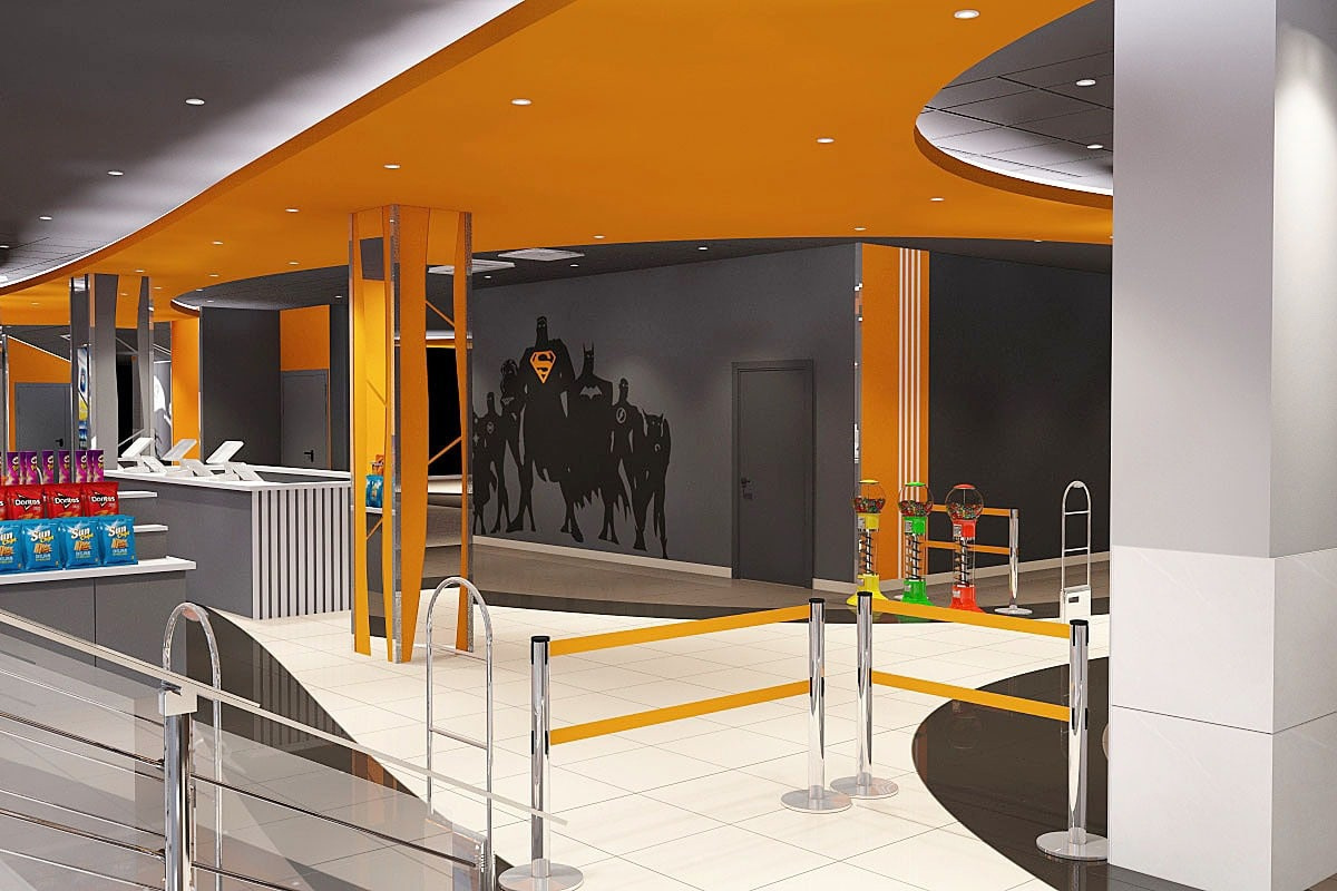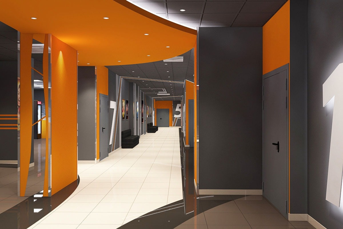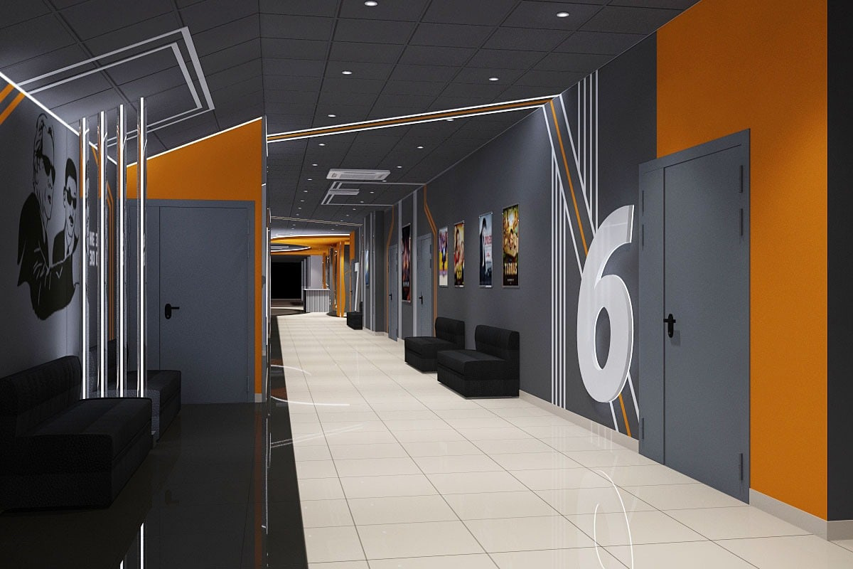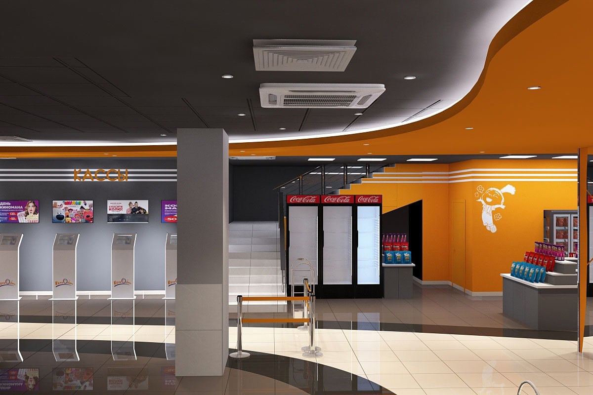 Пожелания заказчика: Необходимо было разработать дизайн проект с учетом фирменного стиля торгового центра, цветовая гамма и стилистика интерьера кинотеатра должна гармонично сочетаться с основными цветами и стилем ТЦ. Также нужно было учесть, что реализация проекта должна быть произведена в краткие сроки и без создания неудобств для посетителей кинотеатра.