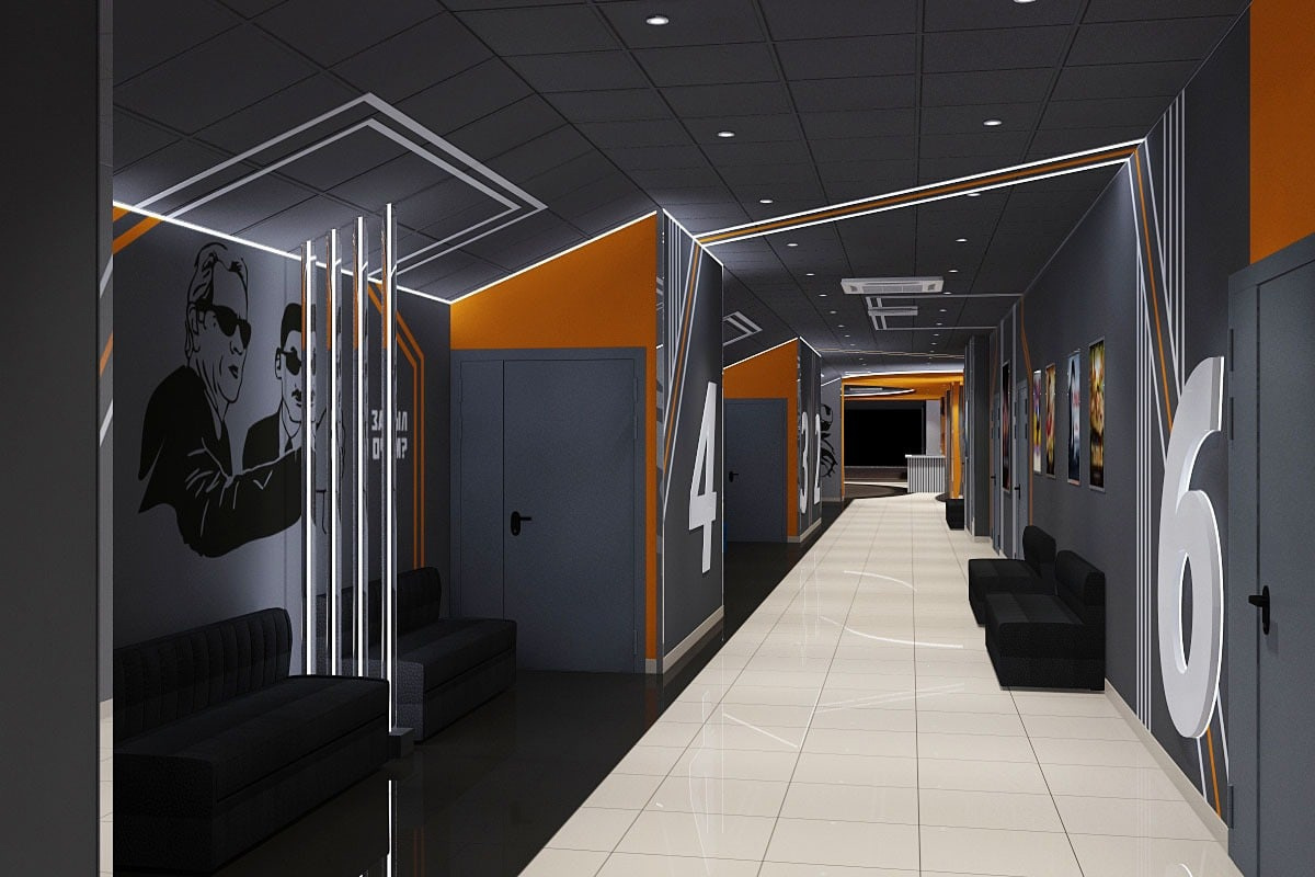 Результат работы над проектом: После согласования с заказчиком, было решено сохранить покрытия пола в неизменном виде, а стен и потолка с сохранением покрытия, но с изменением цветовой гаммы. Изменения в планировке было предложено выполнить за счет переноса только одной перегородки, остальные планировочные решения созданы за счет корпусной мебели. Для декорирования помещения предложено использование декоративных подсветок и художественной росписи в графическом стиле. Система освещения общественных зон кинотеатра предусматривает несколько сценариев освещения: основное освещение, диодная подсветка по контуру, подсветка цифр с обозначением номера зала.