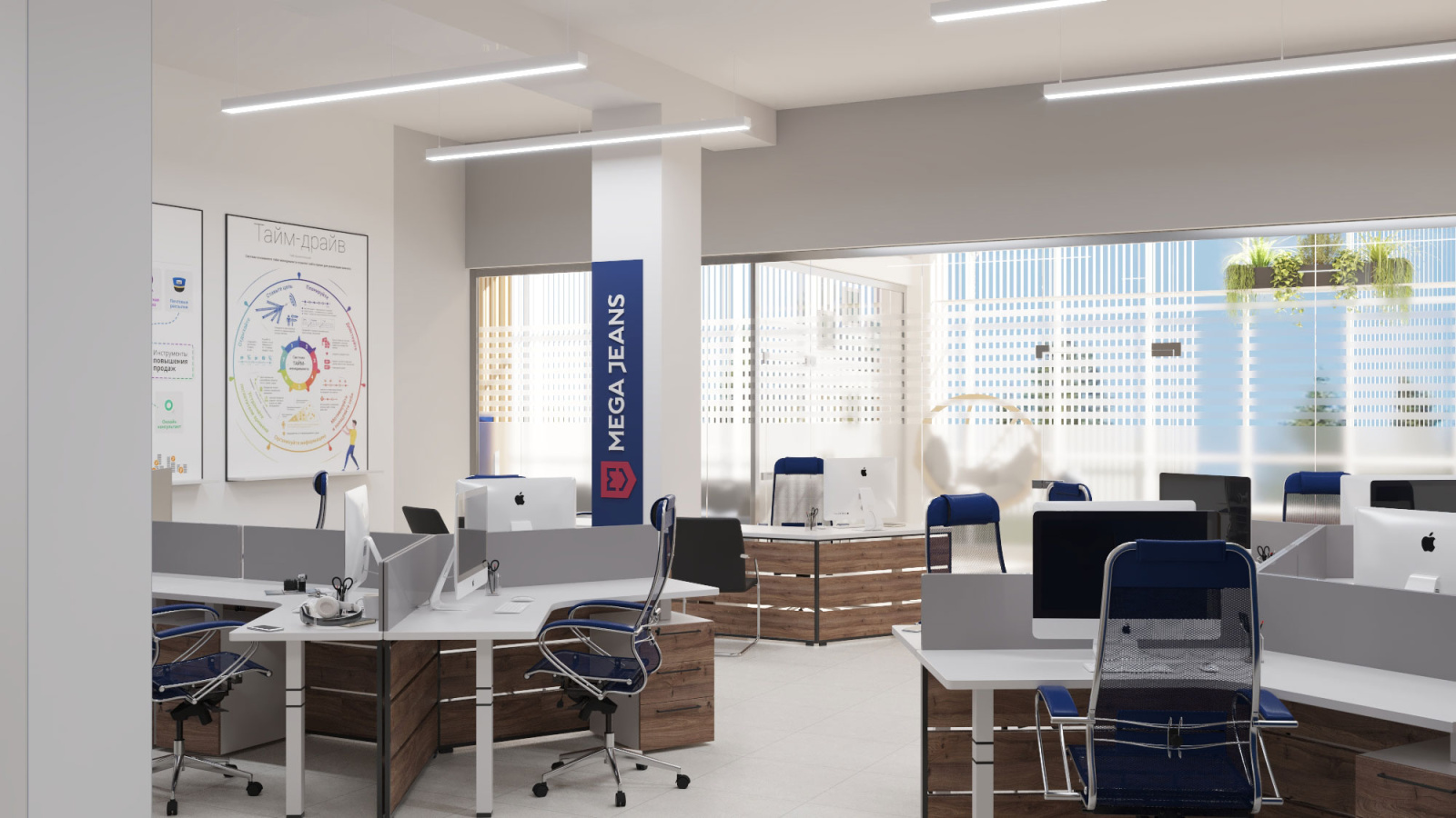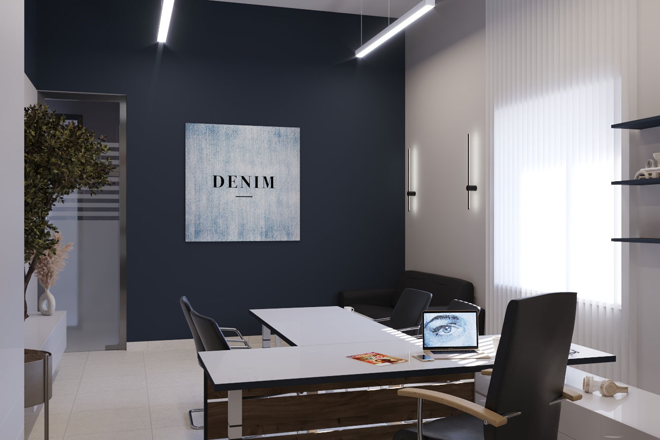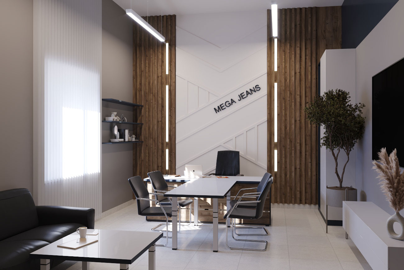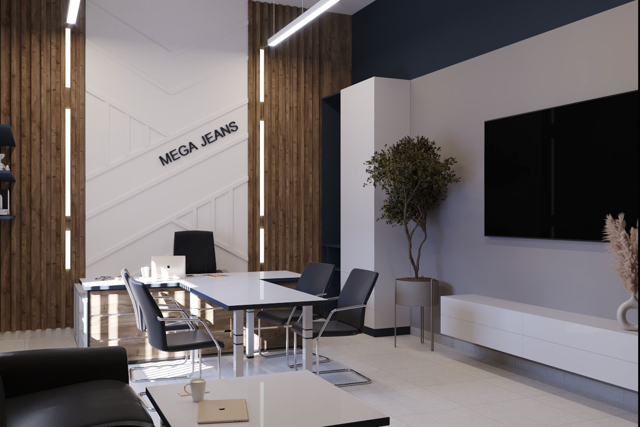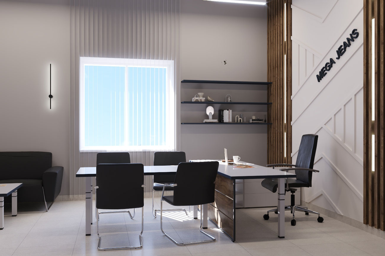 Дизайн проект интерьера офиса компании Mega Jeans в Кирове, общая площадь - 475 кв.м. Представлена 3-D визуализация рабочих кабинетов и переговорных.