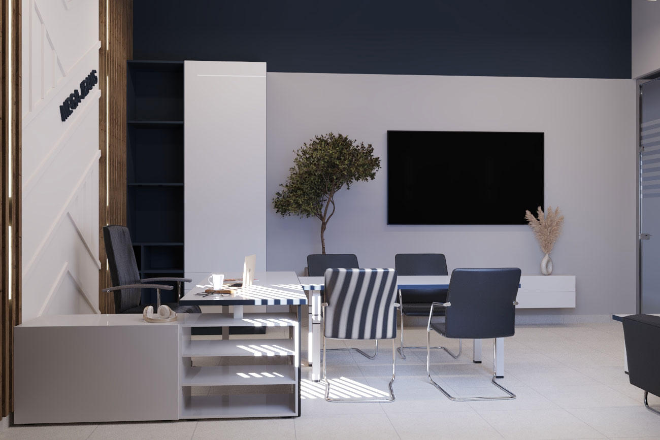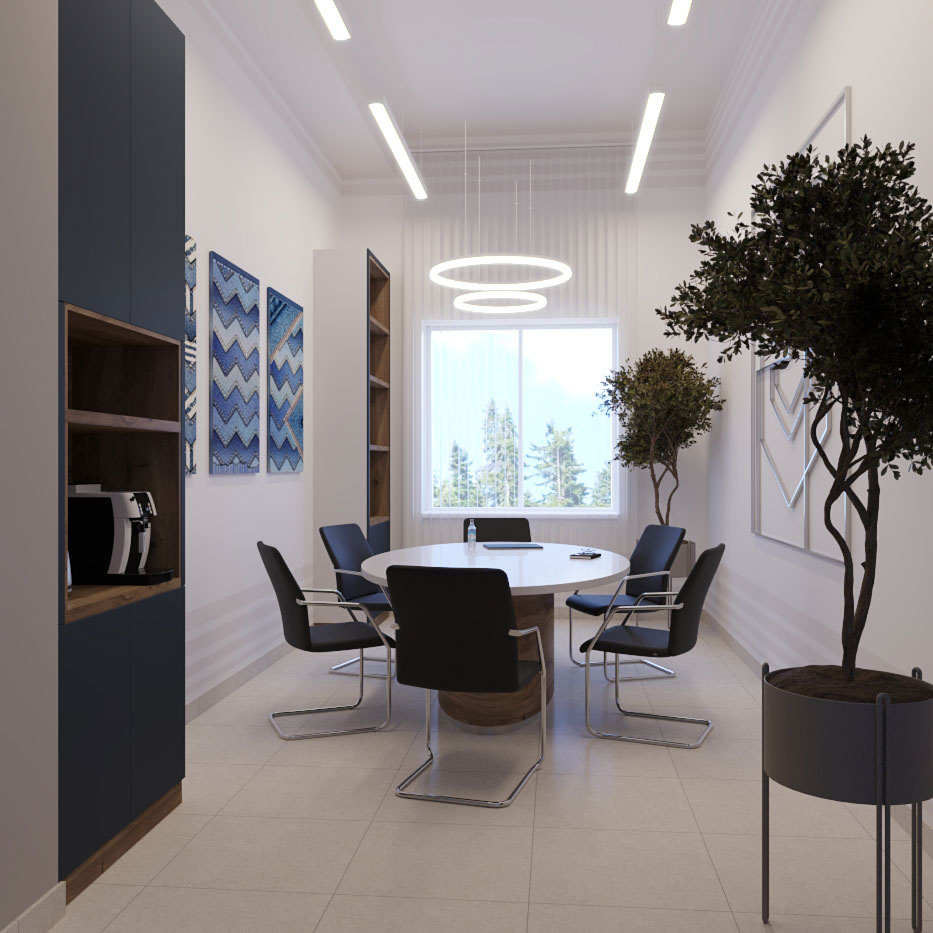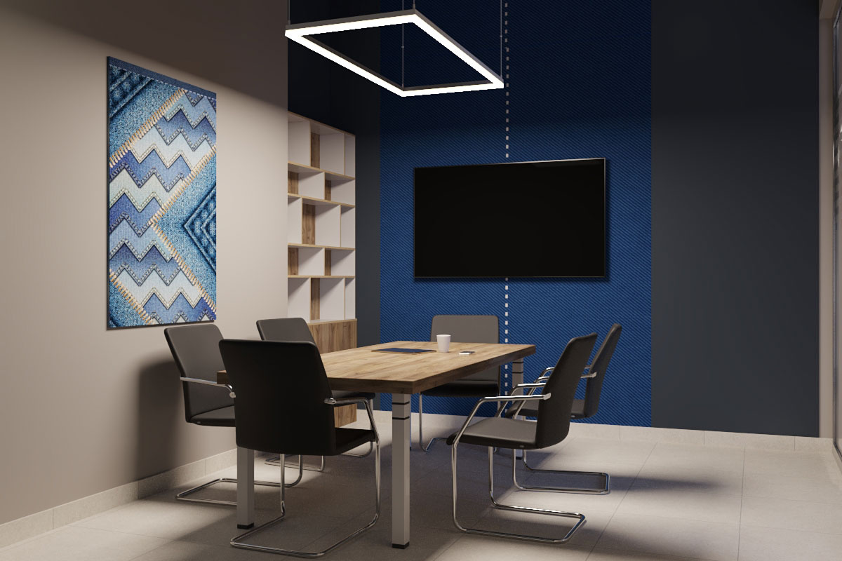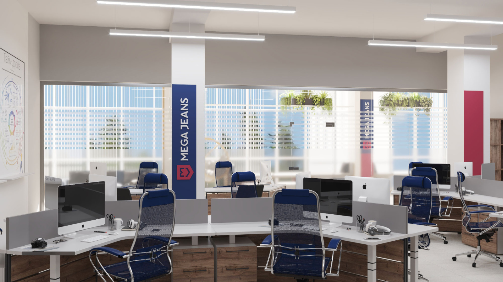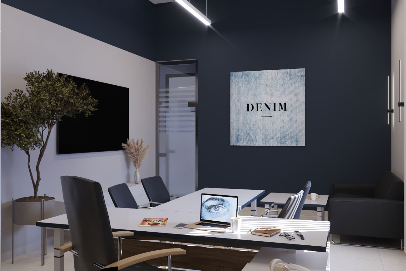 Дизайн проект интерьера офиса компании Mega Jeans в Кирове, общая площадь - 475 кв.м. Представлена 3-D визуализация рабочих кабинетов и переговорных.