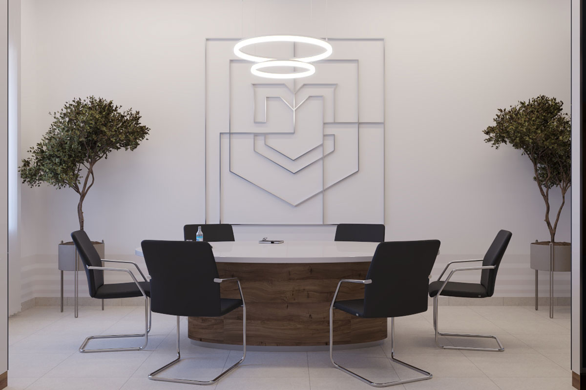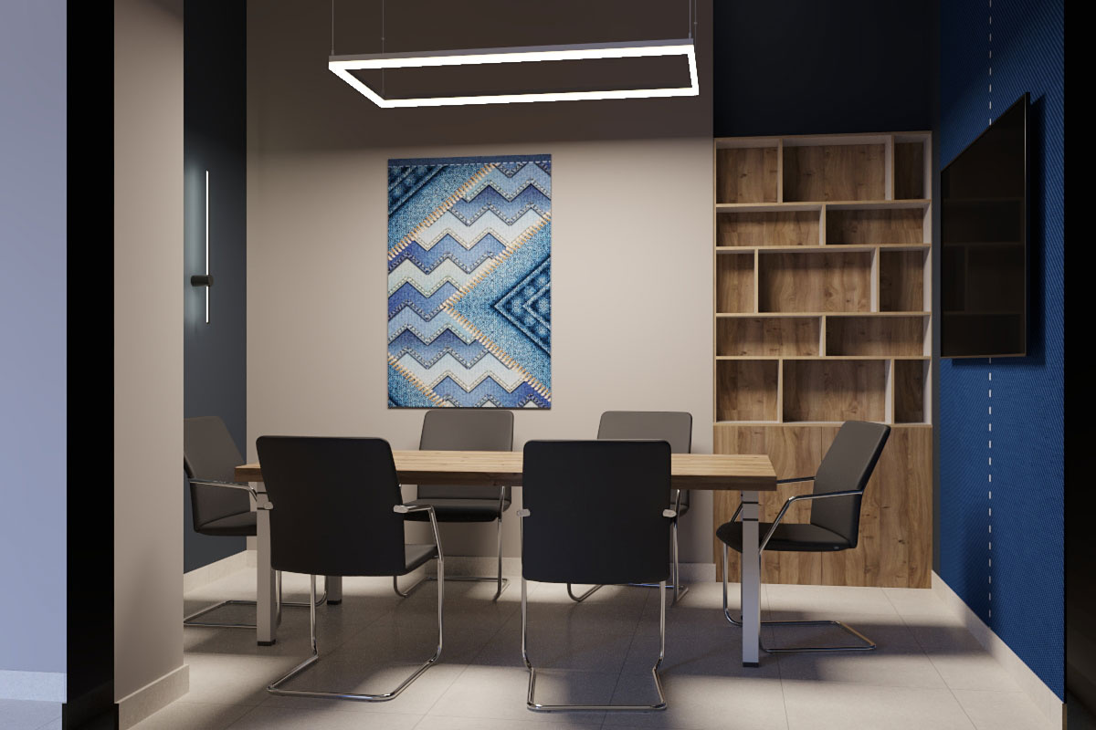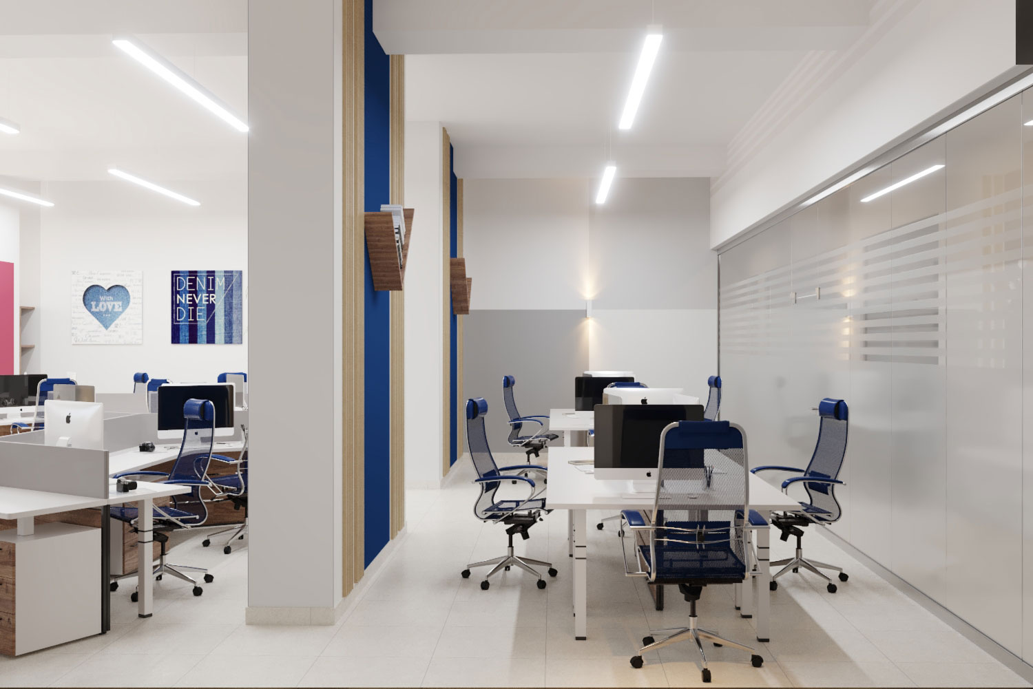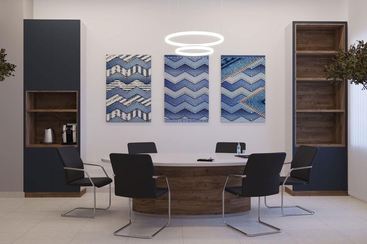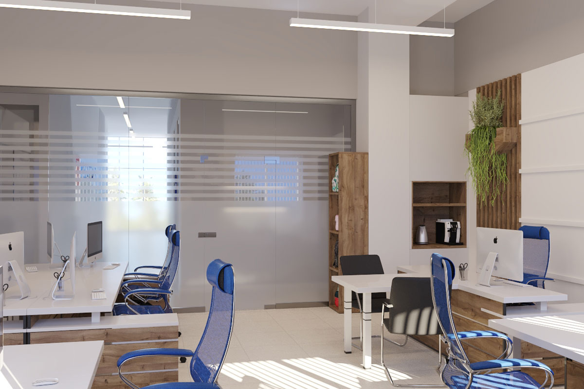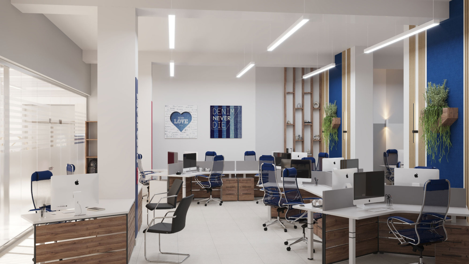 Дизайн проект интерьера офиса компании Mega Jeans в Кирове, общая площадь - 475 кв.м. Представлена 3-D визуализация рабочих кабинетов и переговорных.