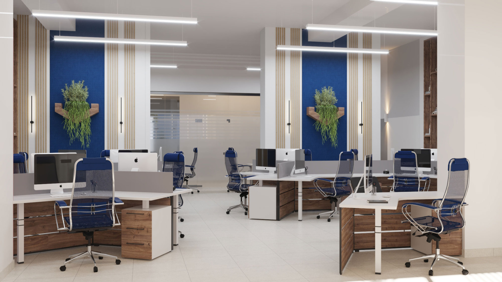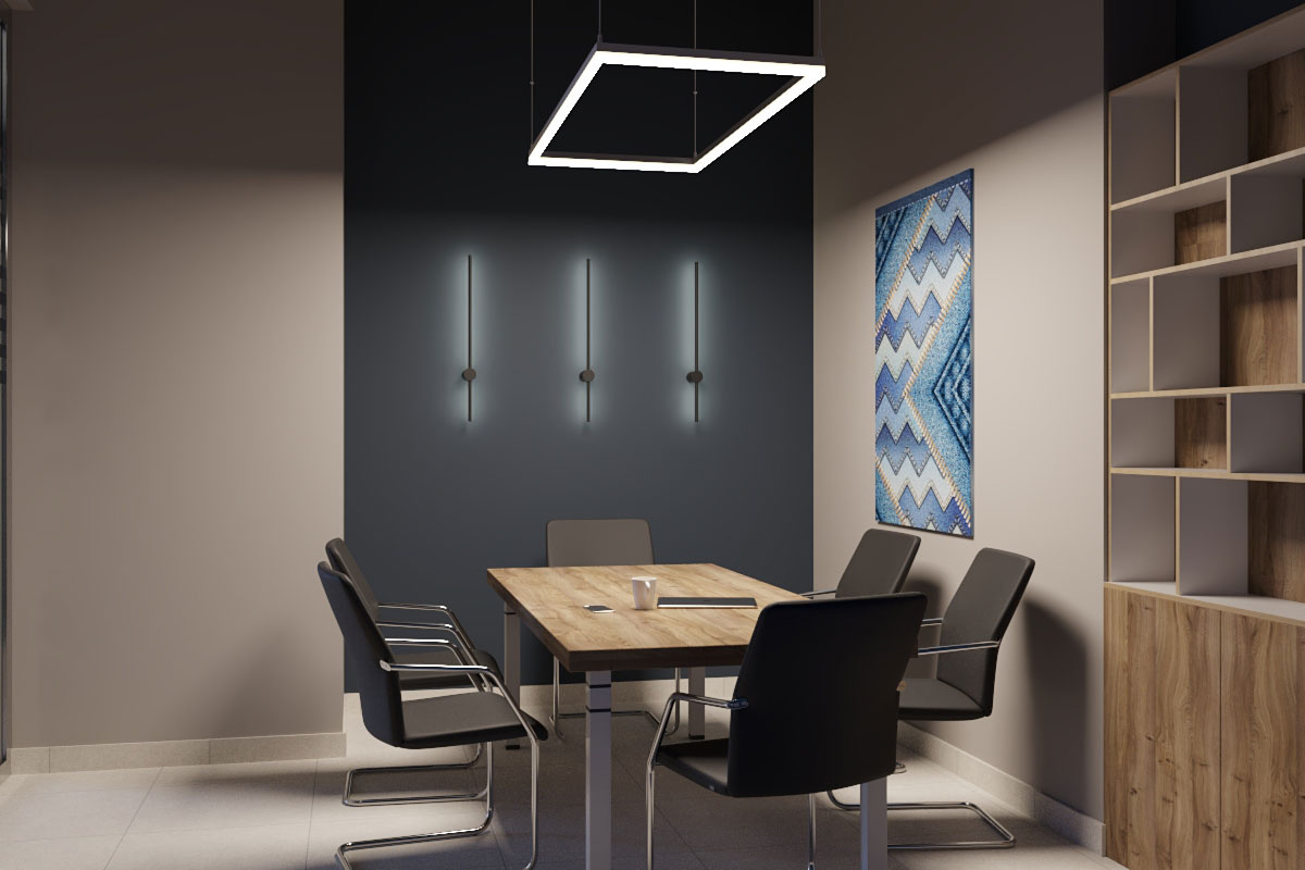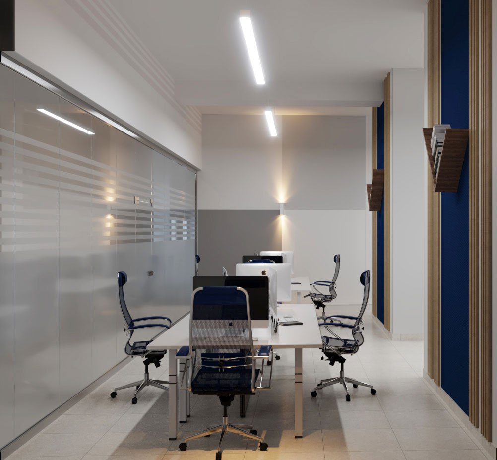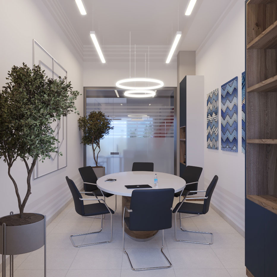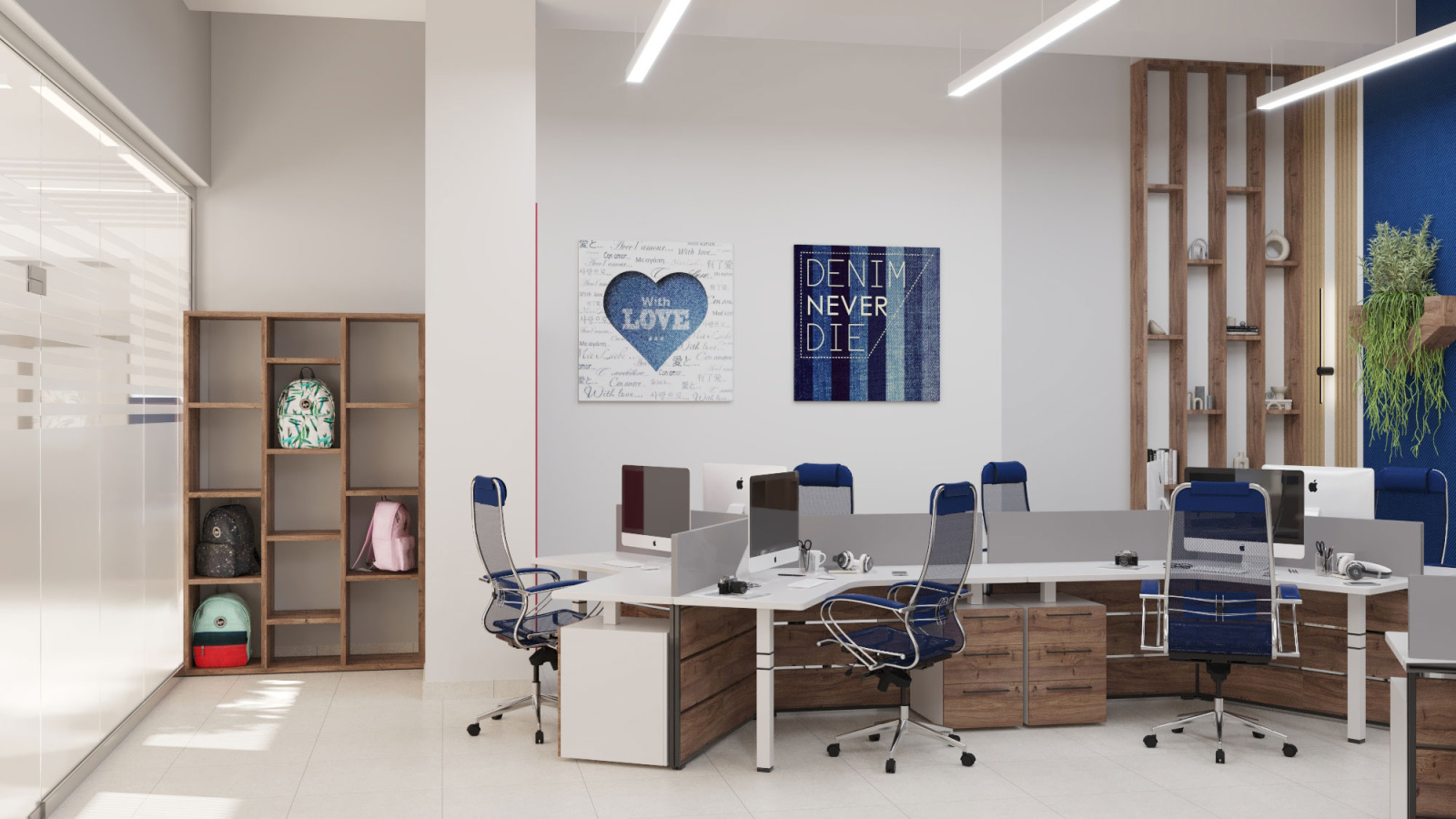 Дизайн проект интерьера офиса компании Mega Jeans в Кирове, общая площадь - 475 кв.м. Представлена 3-D визуализация рабочих кабинетов и переговорных.