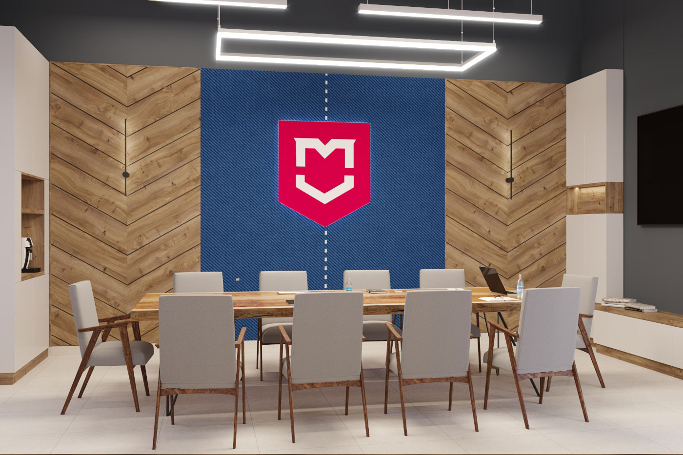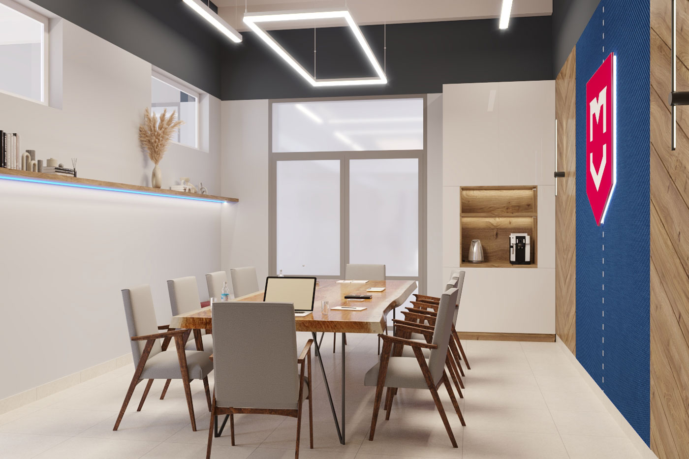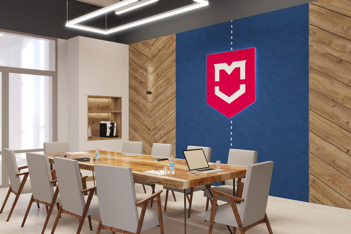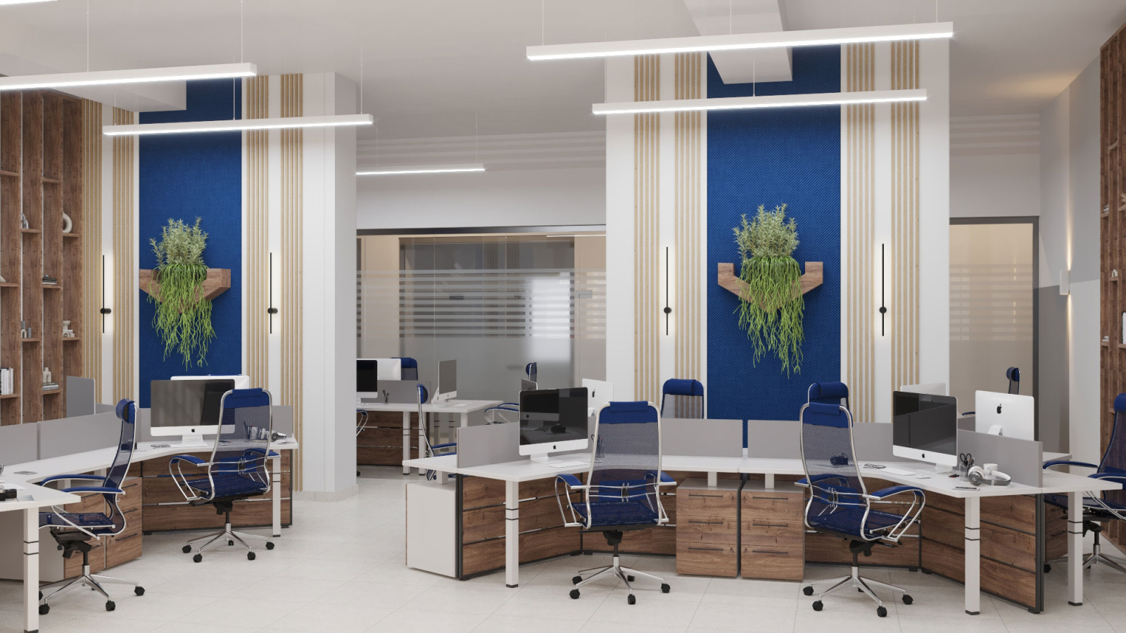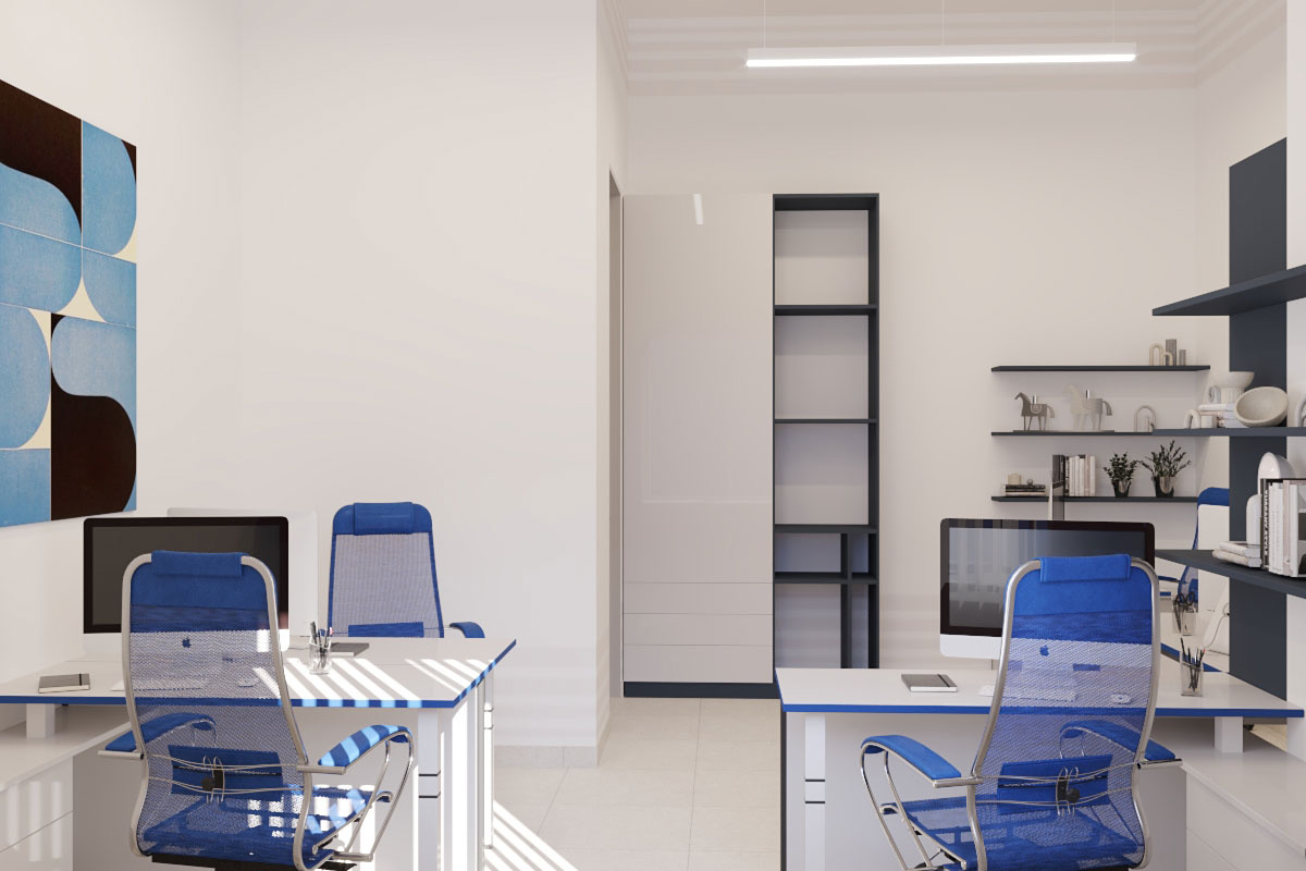 Дизайн проект интерьера офиса компании Mega Jeans в Кирове, общая площадь - 475 кв.м. Представлена 3-D визуализация рабочих кабинетов и переговорных.
