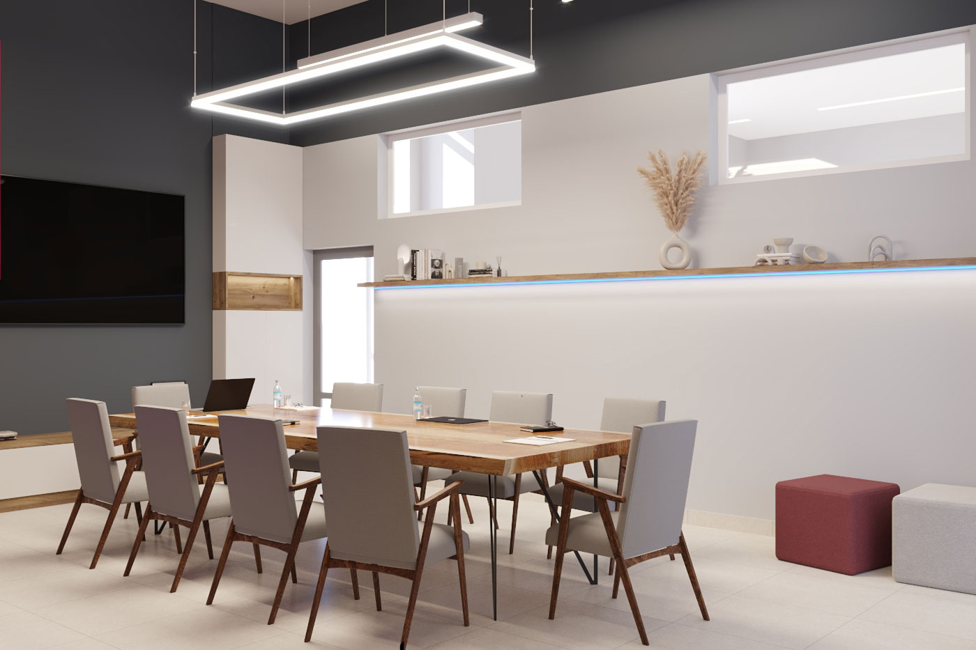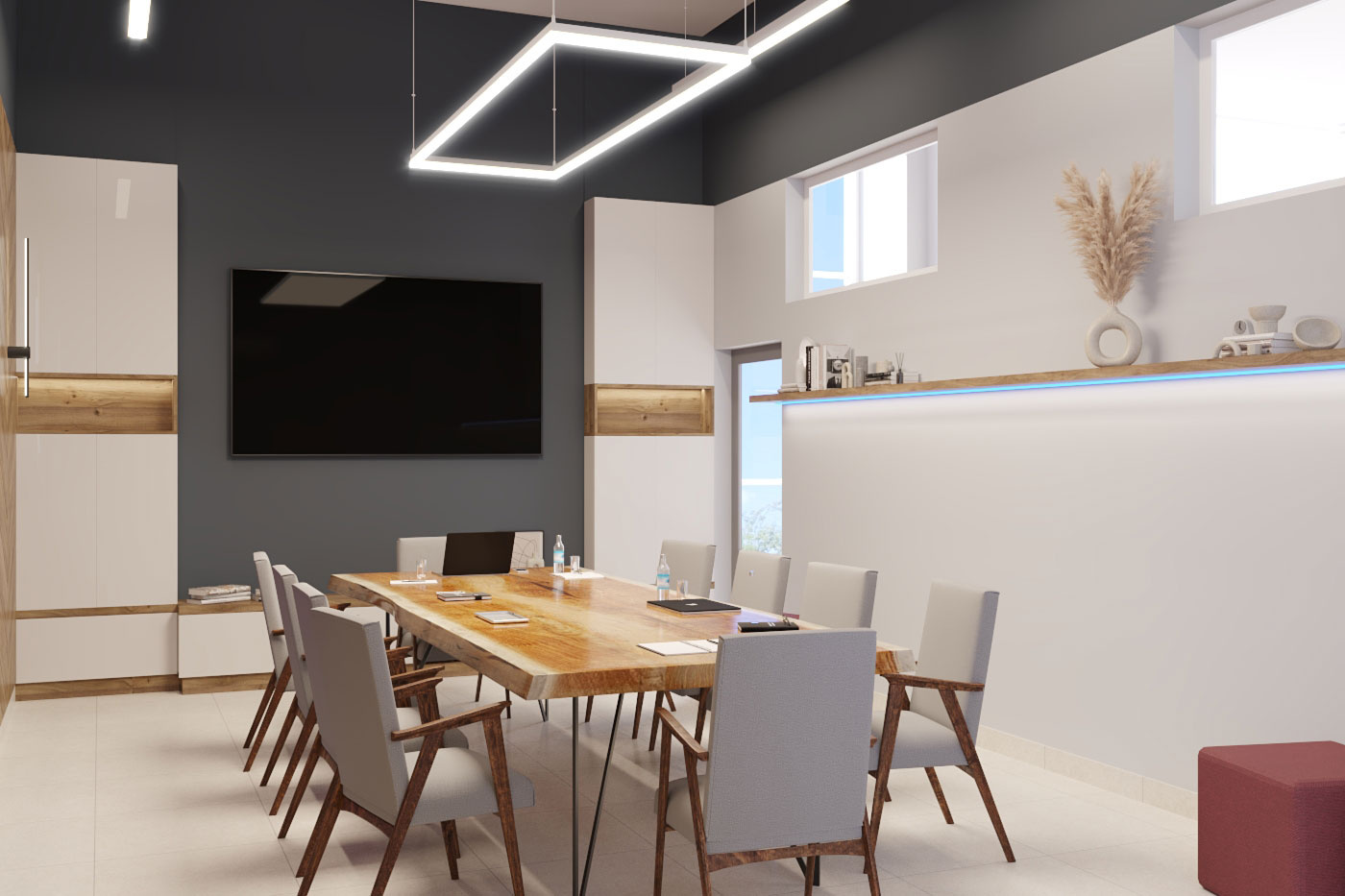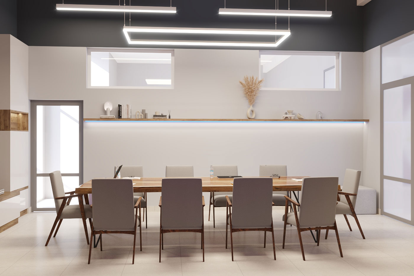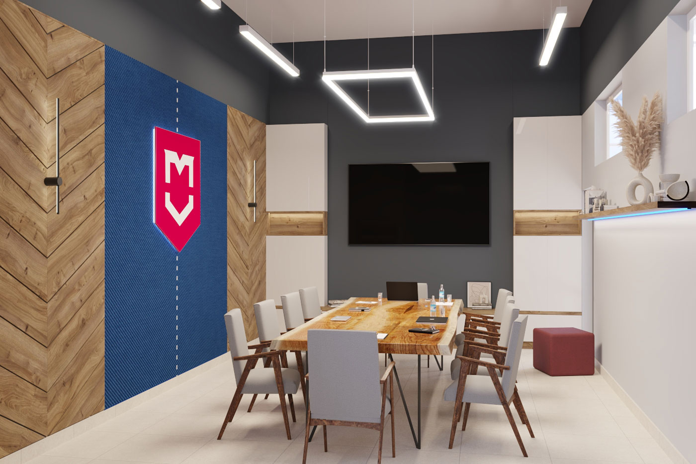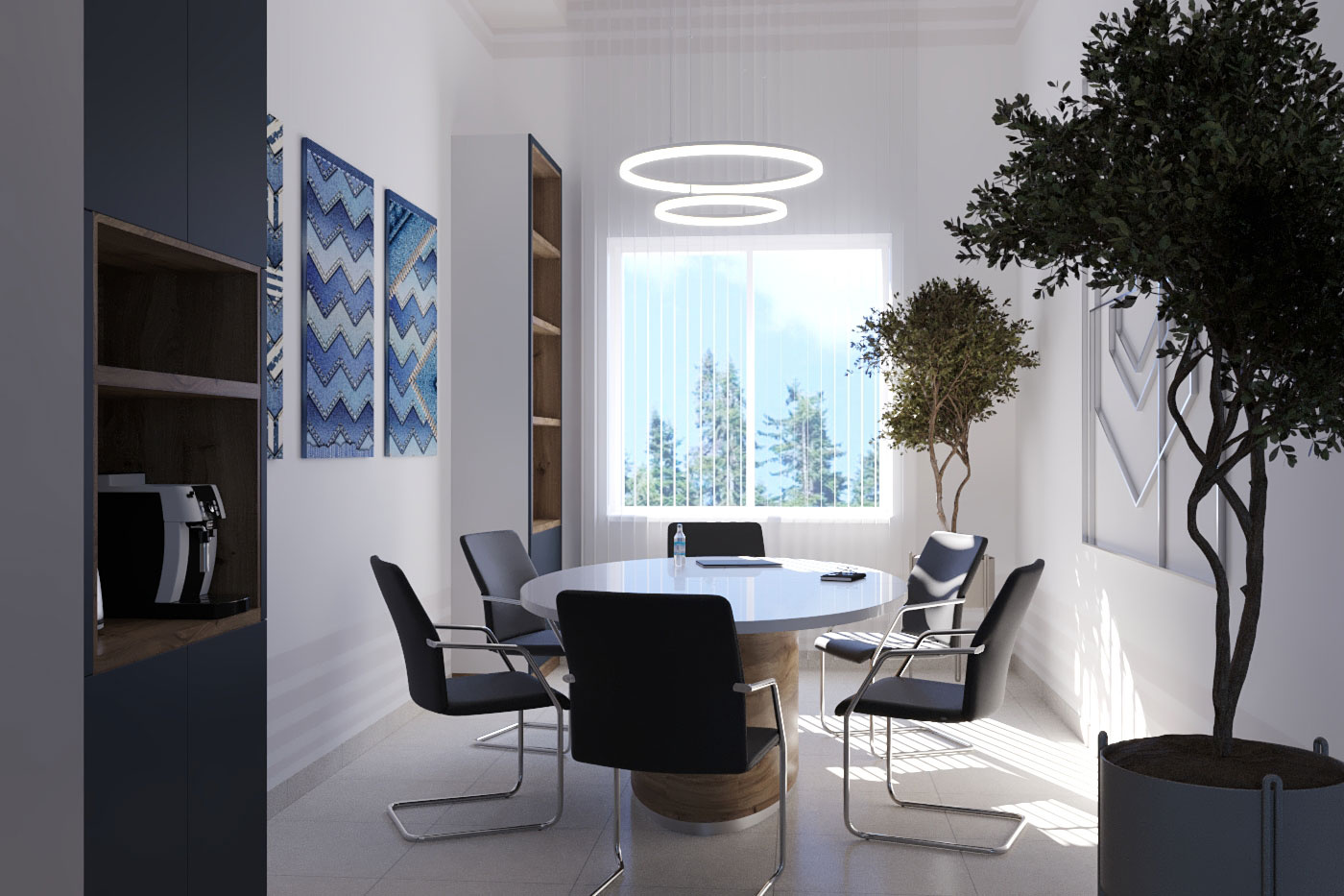 Дизайн проект интерьера офиса компании Mega Jeans в Кирове, общая площадь - 475 кв.м. Представлена 3-D визуализация рабочих кабинетов и переговорных.