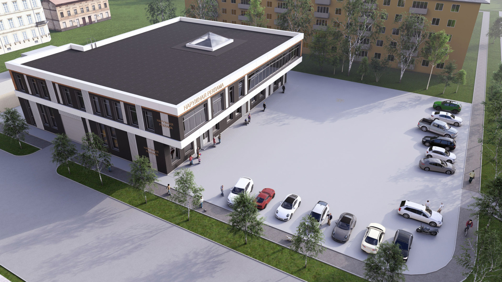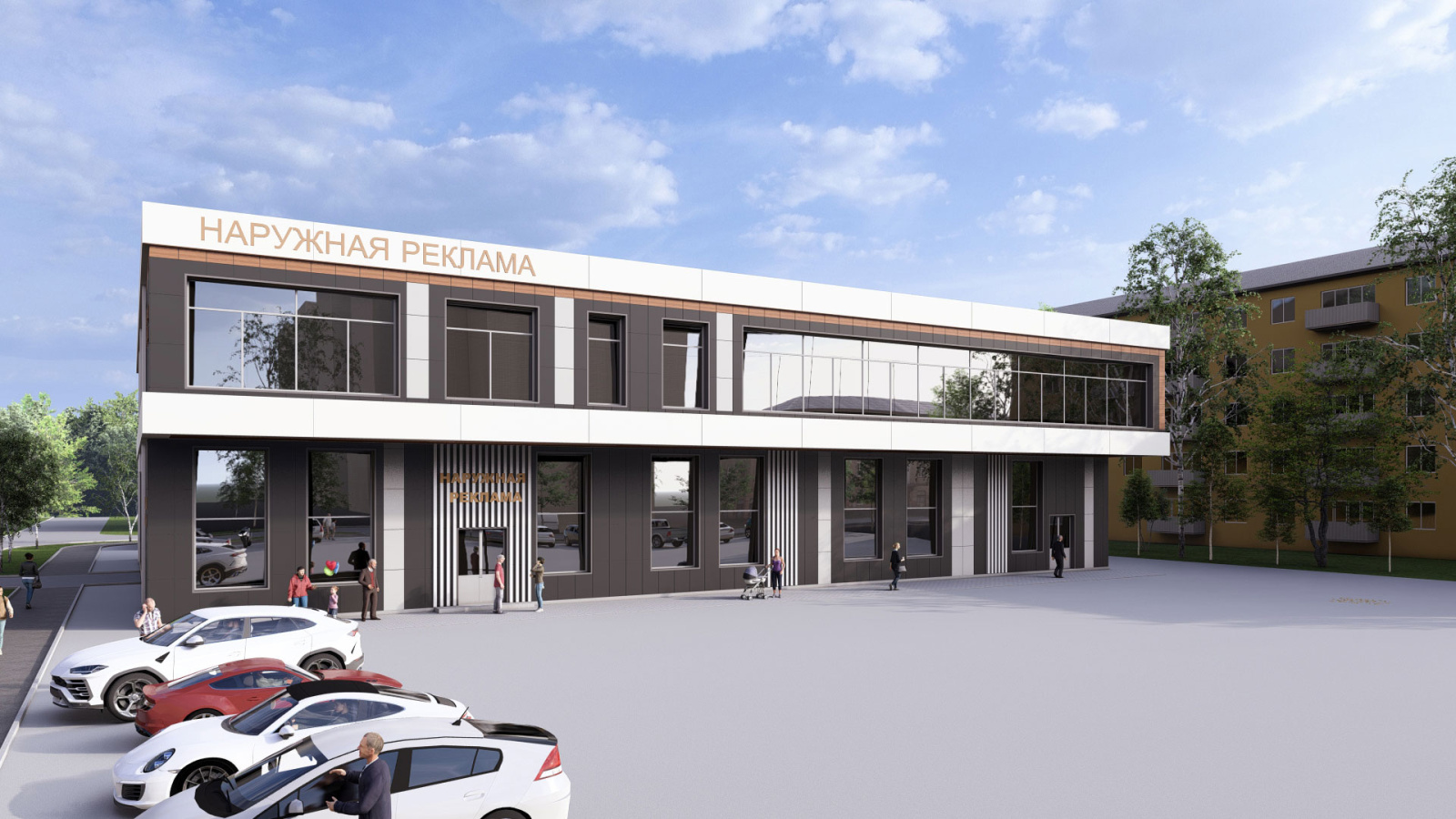 3d визуализация проекта двухэтажного торгового центра (здания административно-промышленного назначения) в современном стиле с парковкой в Кирове. Отделка фасада - вентилируемый фасад из керамогранита контрастных оттенков.