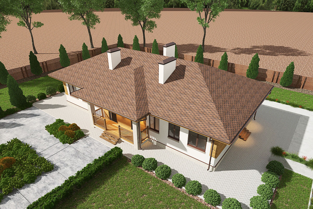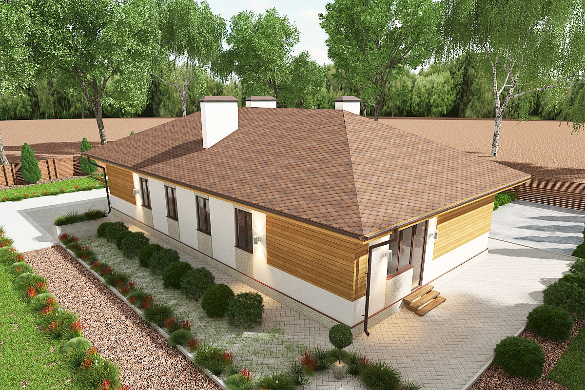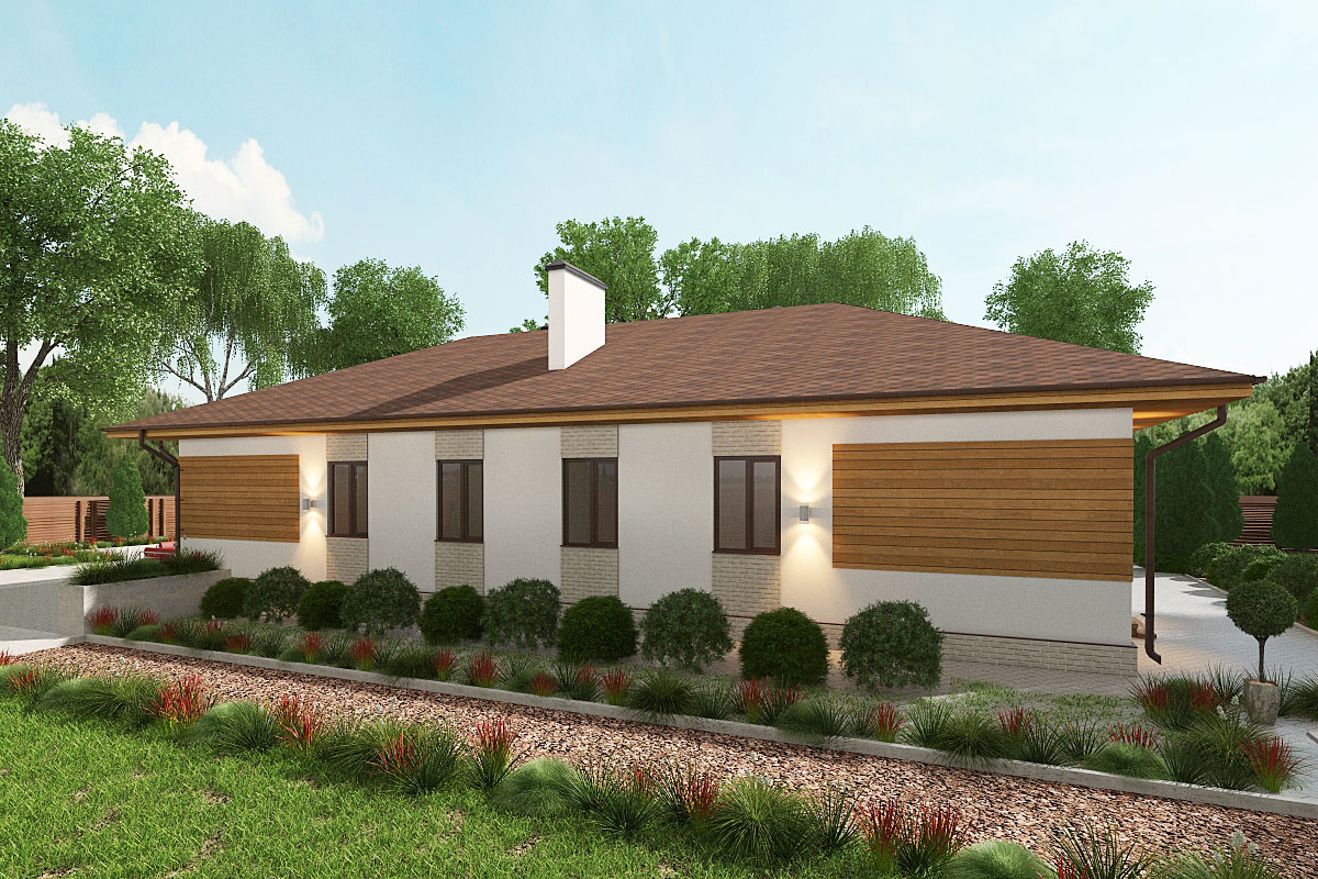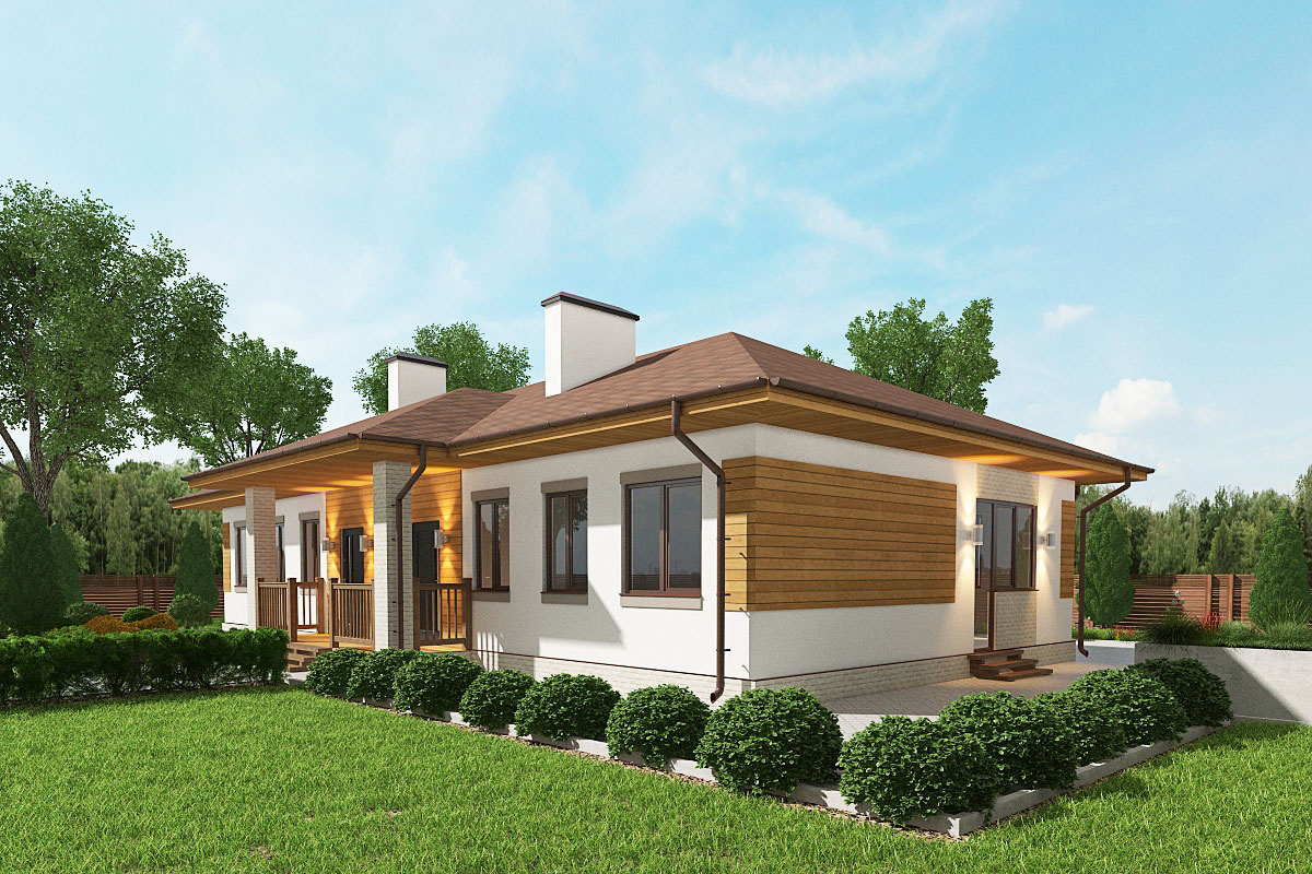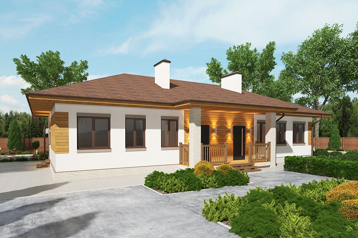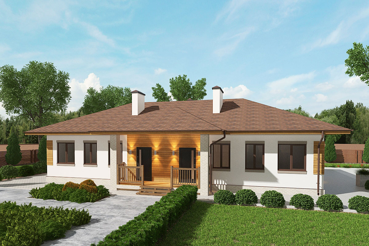 Архитектурный проект одноэтажного дома на 2 семьи по типу Дуплекс из блоков в современном стиле. Особенности дома: оштукатуреный фасад в сочетании с отделкой металлосайдингом с имитацией дерева и облицовочным кирпичом, вальмовая крыша, идентичная планировка в обоих секциях здания, возможность обустройства мансардного этажа. Место расположения - Киров.