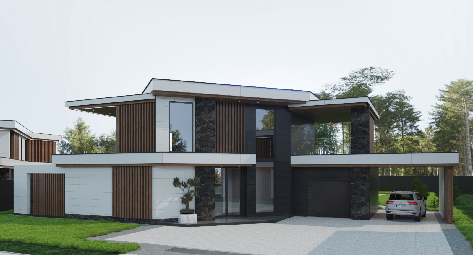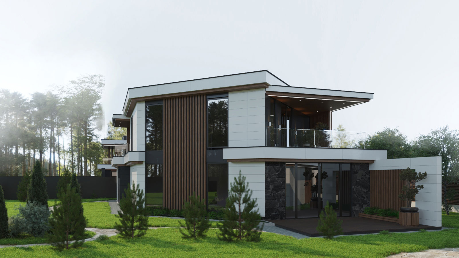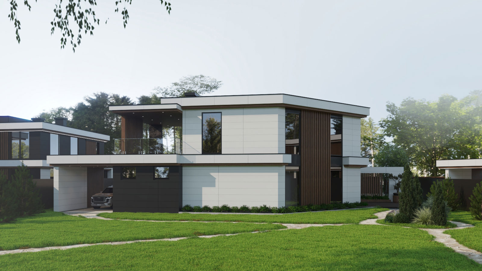Несмотря на различия, каждый дом имеет навес для авто, гараж с хозблоком и просторную террасу. Архитектура домов с плоской кровлей и панорамными окнами выполнена в стиле современный минимализм с использованием в отделке преимущественно натуральных материалов. Специфика остекления домов гарантирует обилие естественного освещения.