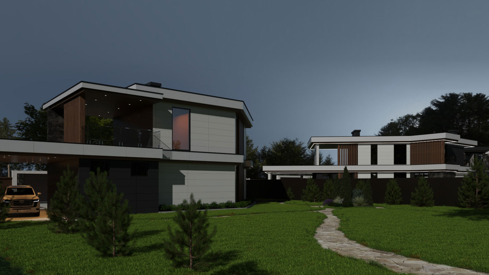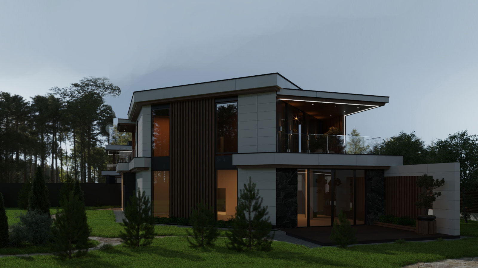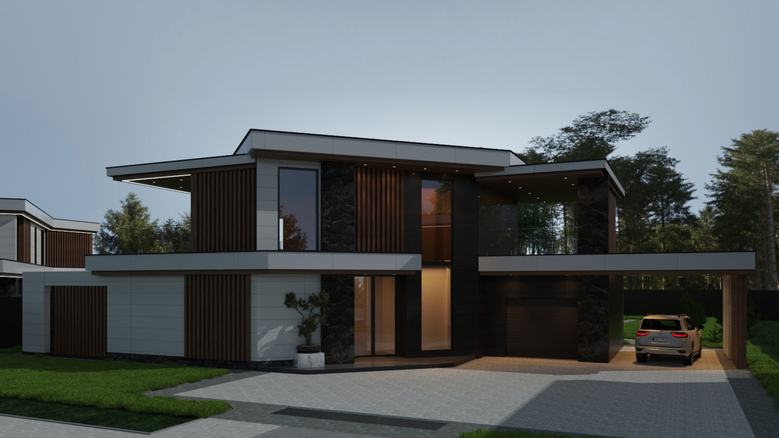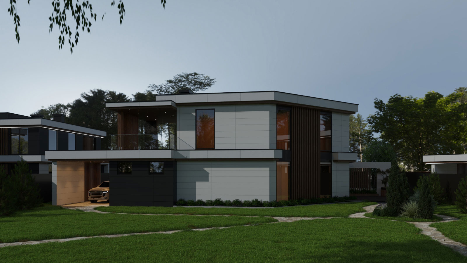 Несмотря на различия, каждый дом имеет навес для авто, гараж с хозблоком и просторную террасу. Архитектура домов с плоской кровлей и панорамными окнами выполнена в стиле современный минимализм с использованием в отделке преимущественно натуральных материалов. Специфика остекления домов гарантирует обилие естественного освещения.