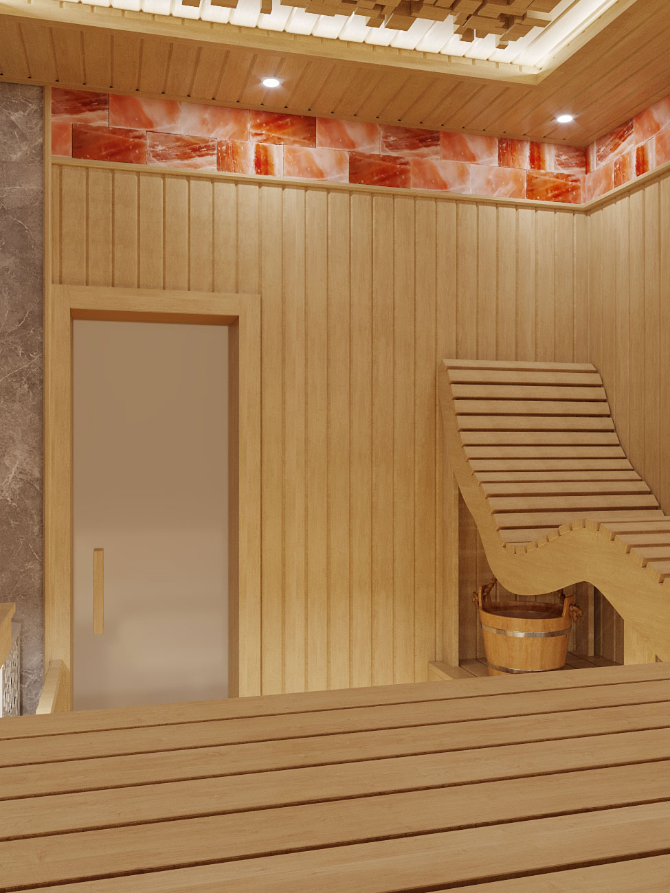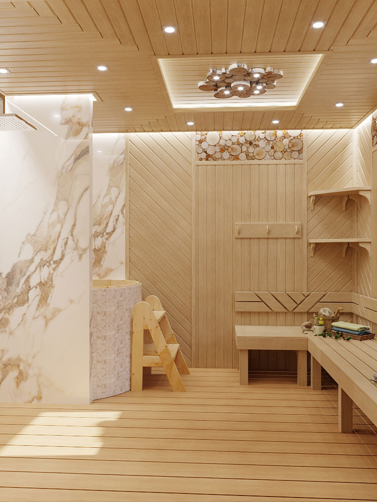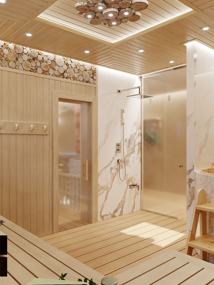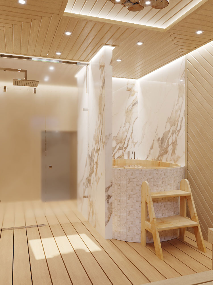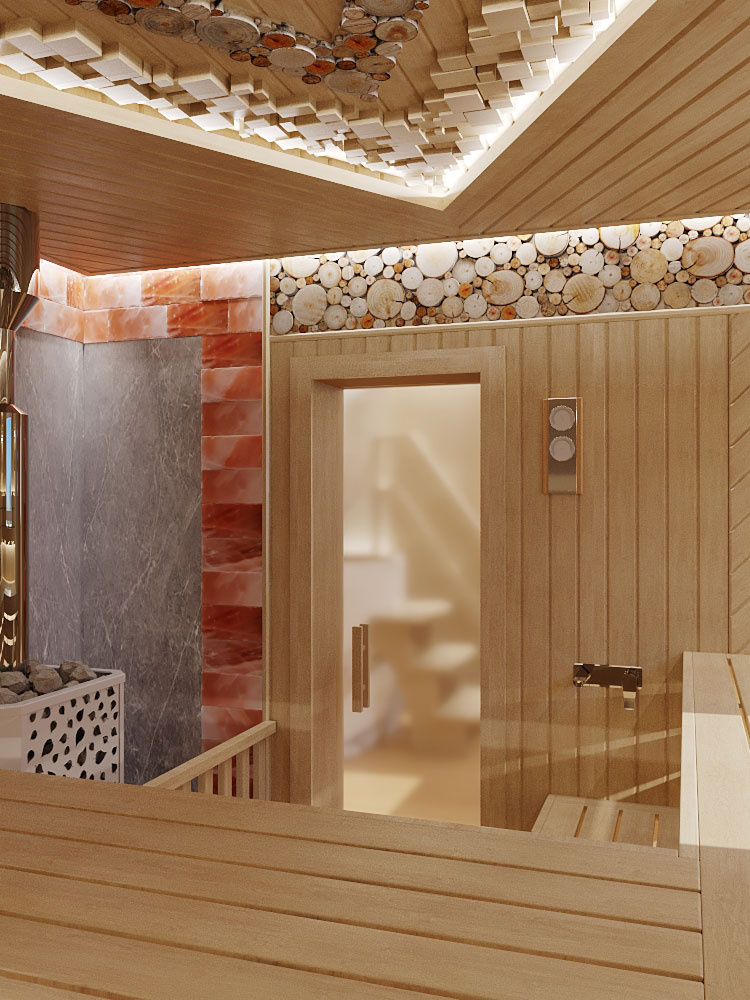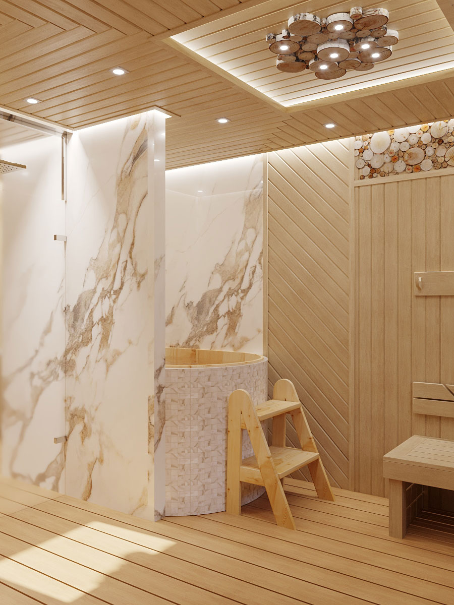 Дизайн проект интерьера бани с купелью и отдельной сауной с анатомическим лежаком. Оформление стен и потолка слэбами из ценных пород древесины в сочетании с плитками из гималайской соли.
