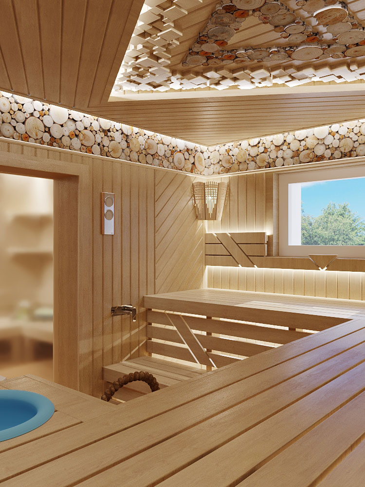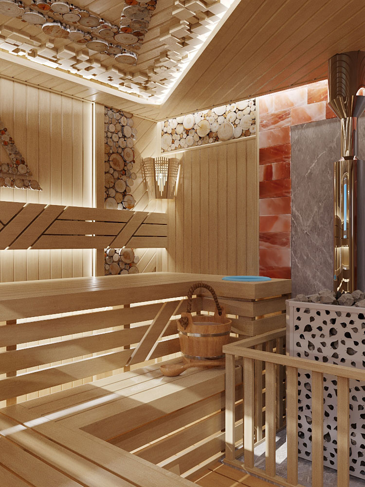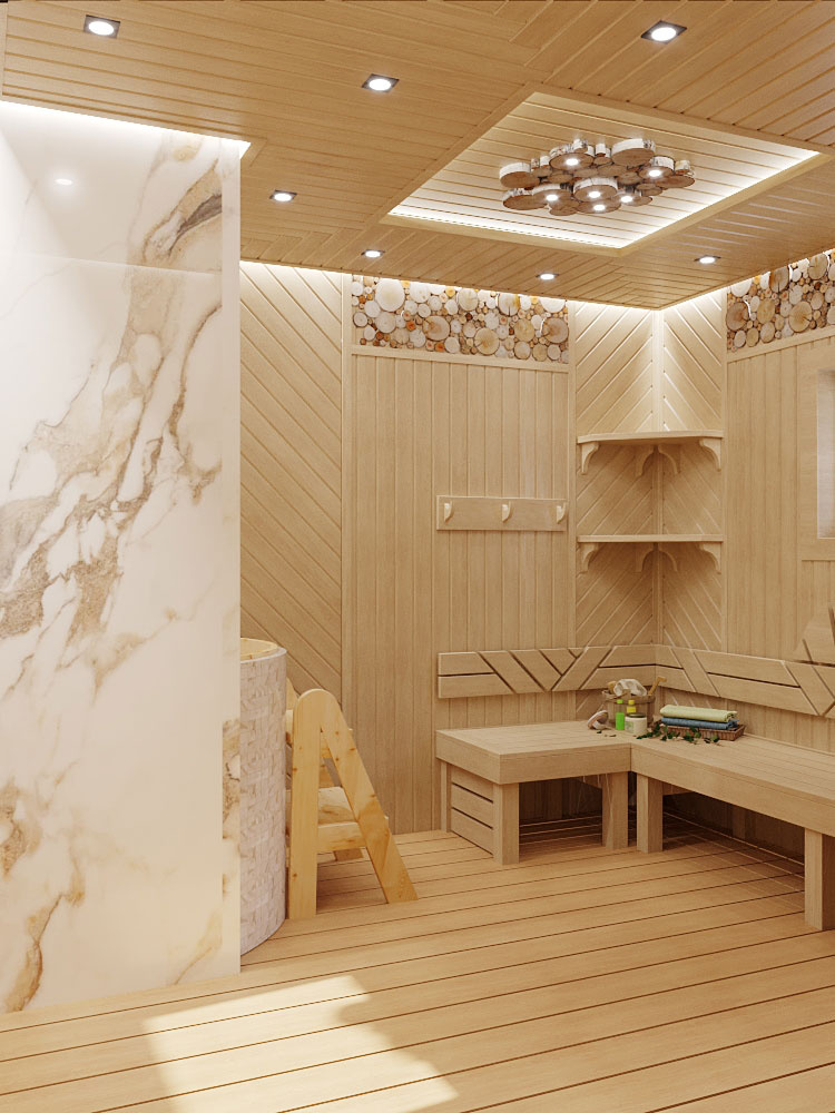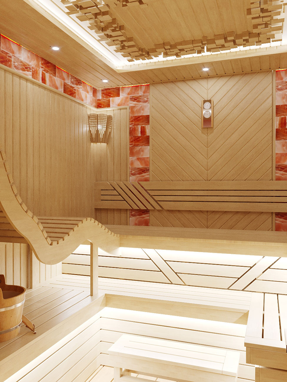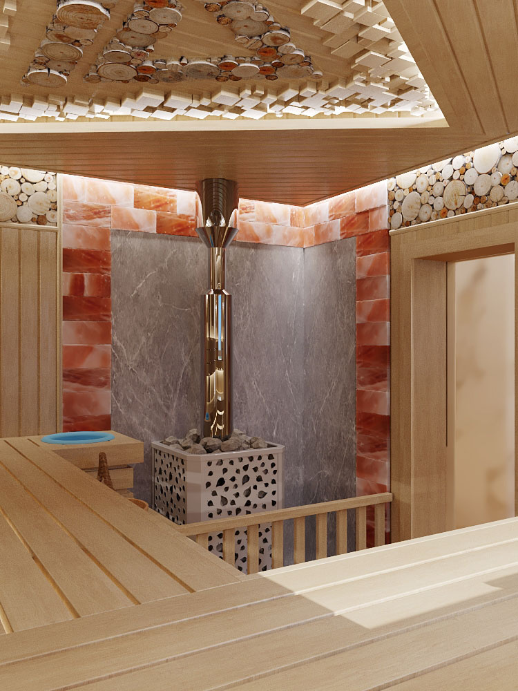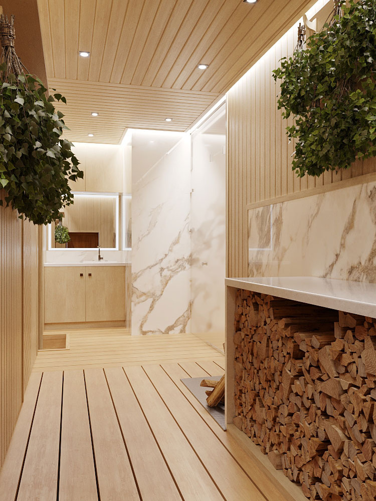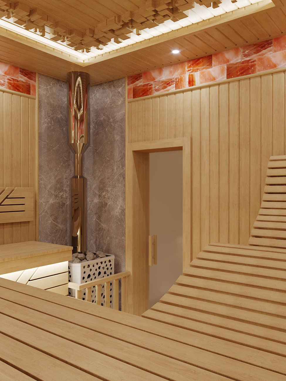 Дизайн проект интерьера бани с купелью и отдельной сауной с анатомическим лежаком. Оформление стен и потолка слэбами из ценных пород древесины в сочетании с плитками из гималайской соли.