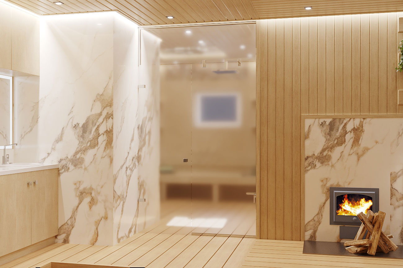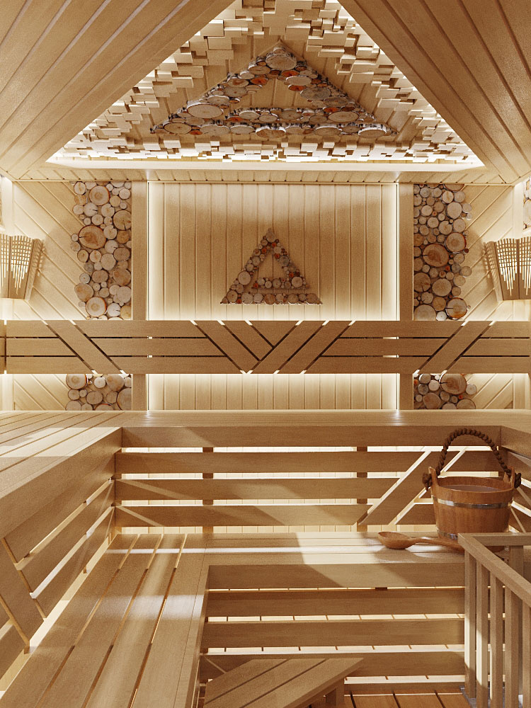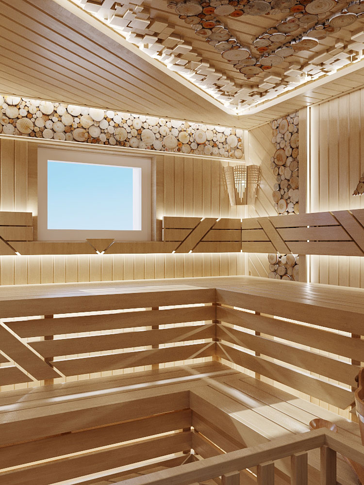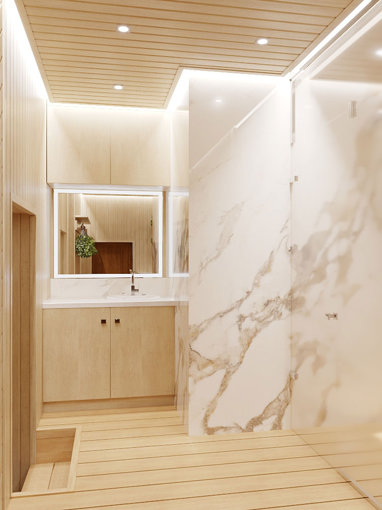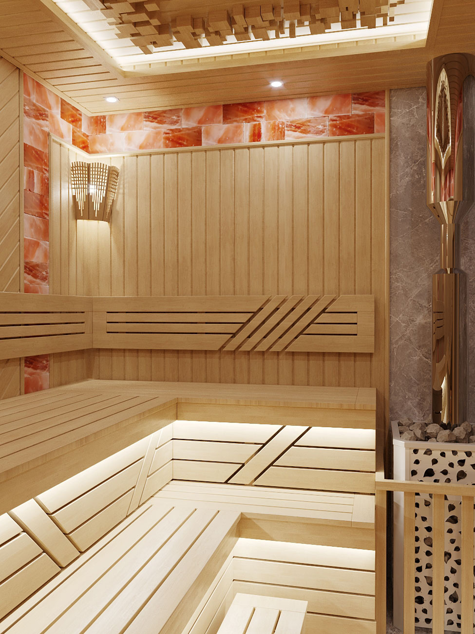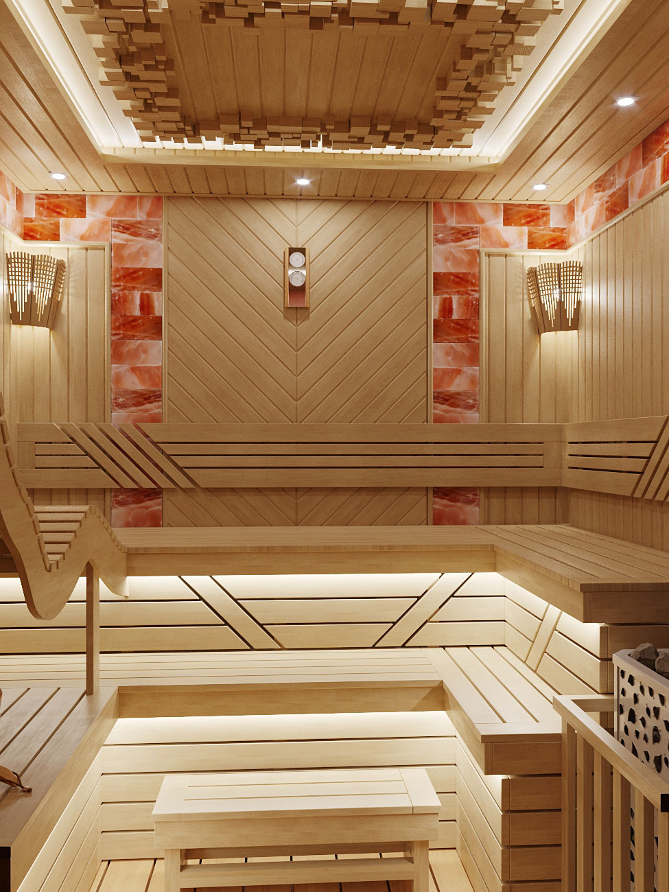 Дизайн проект интерьера бани с купелью и отдельной сауной с анатомическим лежаком. Оформление стен и потолка слэбами из ценных пород древесины в сочетании с плитками из гималайской соли.