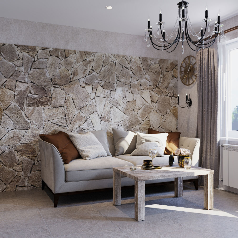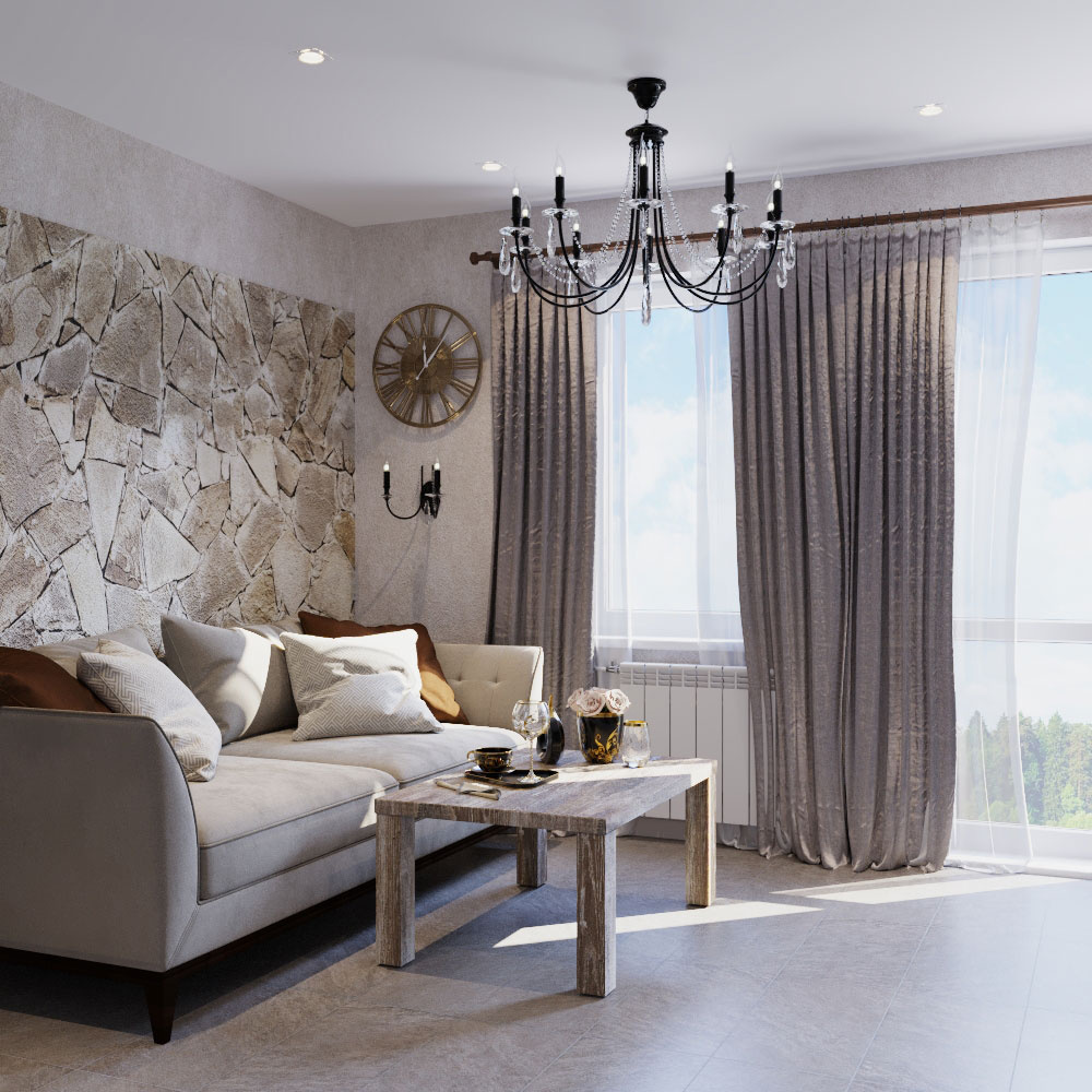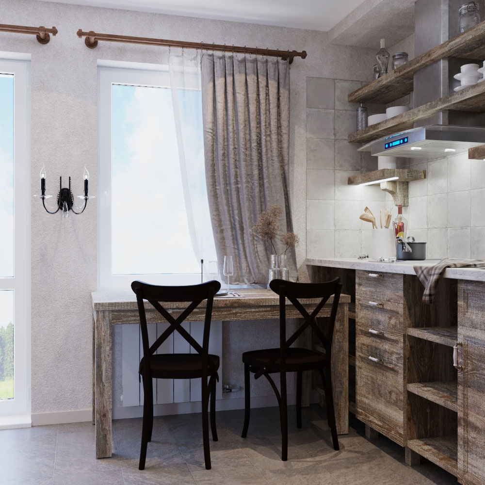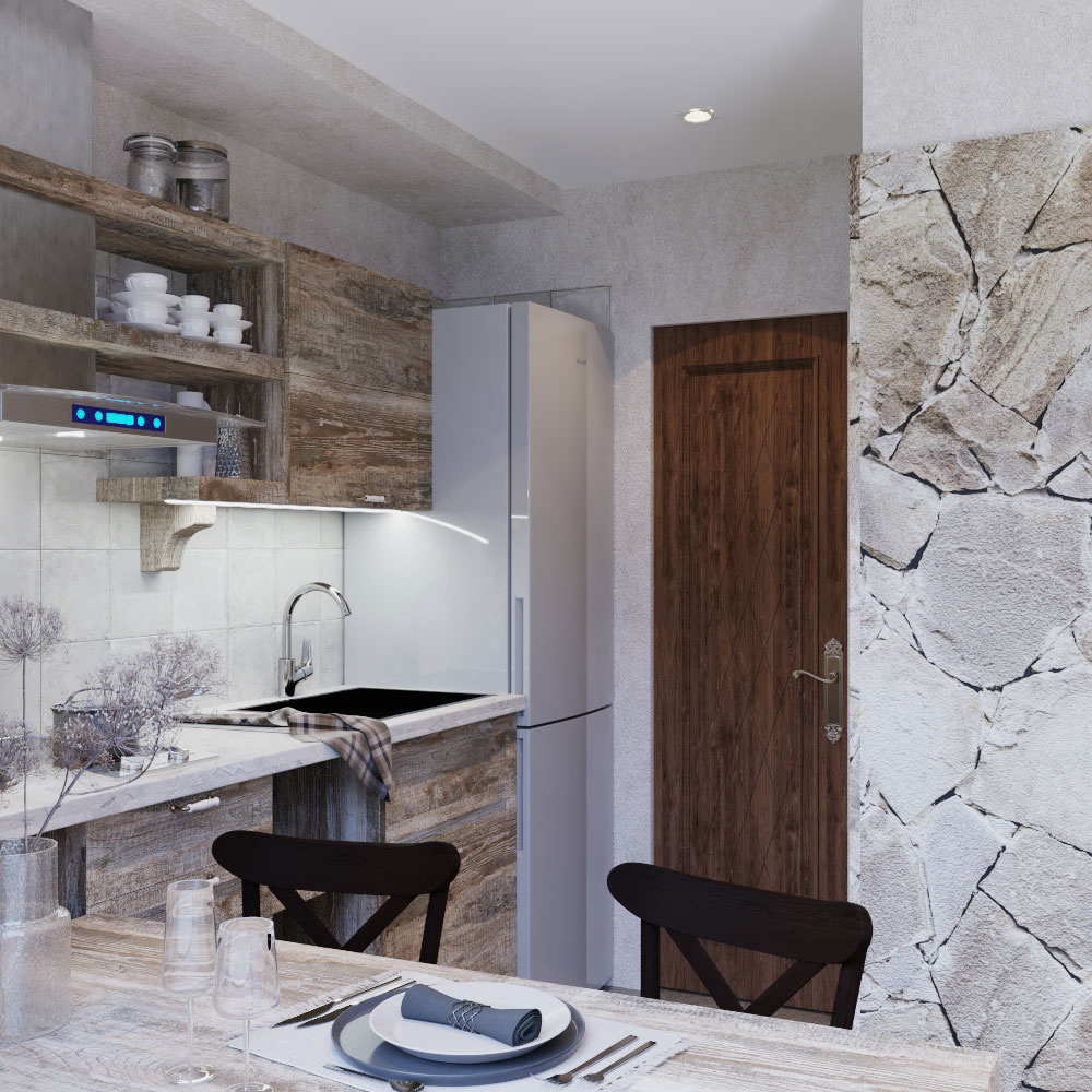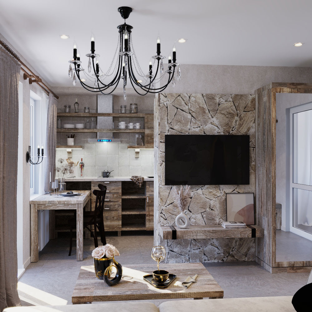 Пожелания заказчика: "мужской характер" помещения, элементы "кавказкого" стиля, мебель из массива, отделка стен натуральным камнем, функциональная кухня с открыми и крытыми местами для хранения.