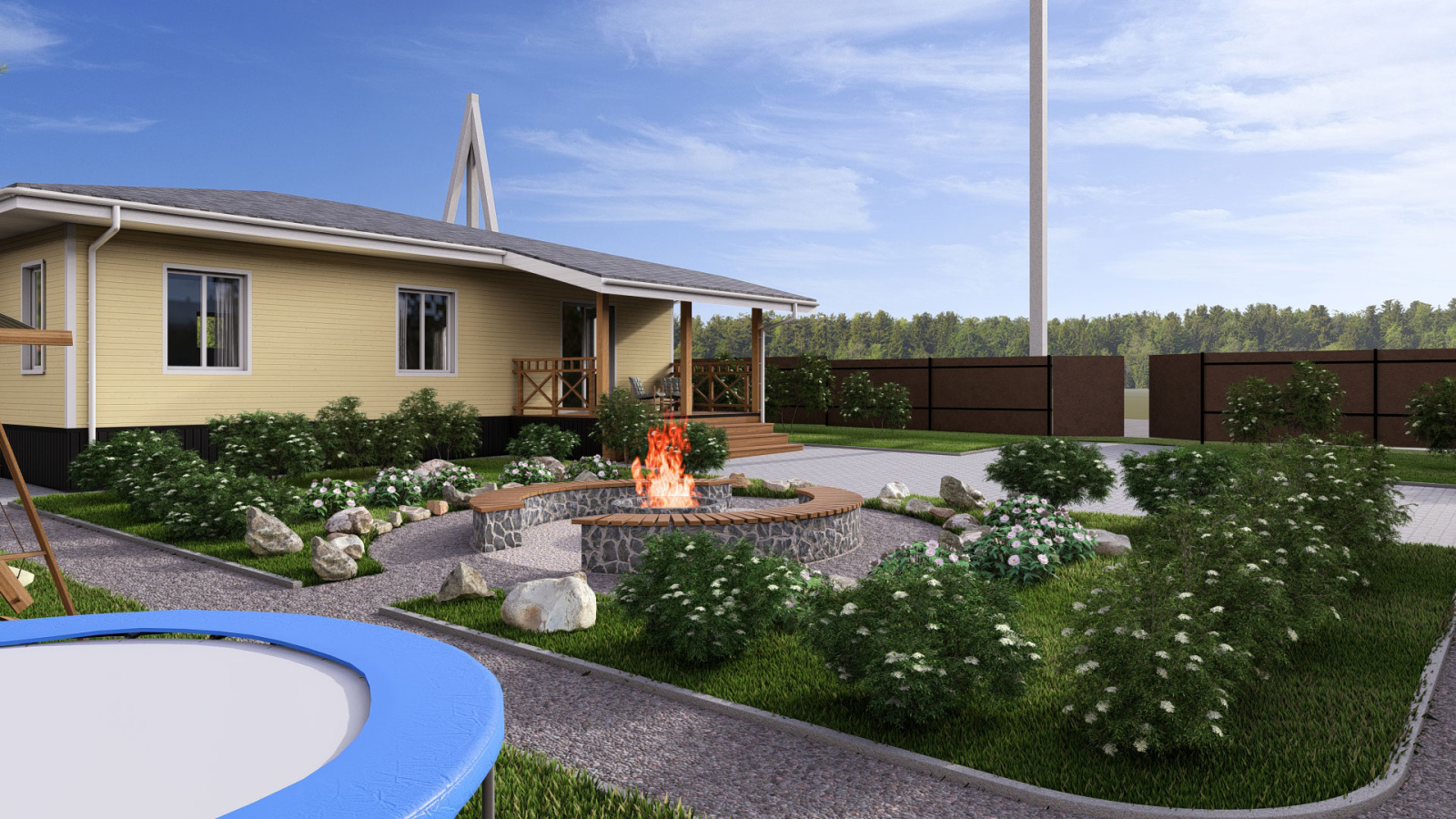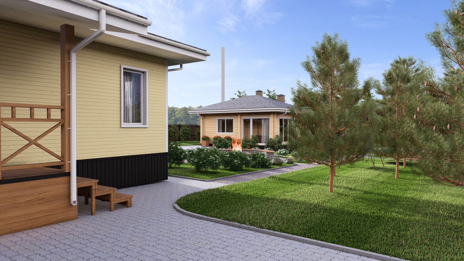 Дизайн проект загородного участка с баней и бассейном, выделенной зоной отдыха и гаражом с навесом в Кирове.